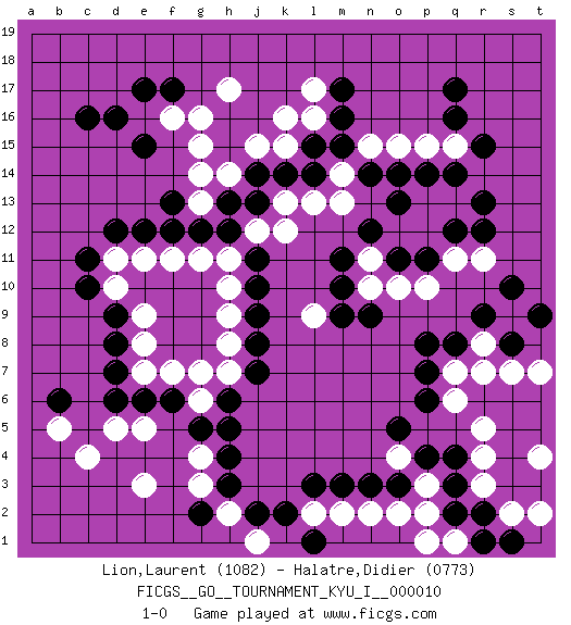Last move : 1-0 2009 February 13 21:7:35 [Event "FICGS__GO__TOURNAMENT_KYU_I__000010"] [Site "FICGS"] [Date "2008.09.15"] [Round "1"] [Black "Lion,Laurent"] [White "Halatre,Didier"] [Result "1-0"] [Rating 1 "1082"] [Rating 2 "0773"] 1.q16 c4 2.d16 r4 3.p4 p3 4.o3 o4 5.q3 p2 6.q4 r3 7.q2 o2 8.n3 n2 9.m3 m2 10.l3 l2 11.o5 q1 12.r2 s2 13.s1 t2 14.r1 t4 15.k2 p1 16.l1 e3 17.c10 r5 18.p6 q6 19.p7 q7 20.p8 p10 21.q8 r8 22.r9 s9 23.s8 r7 24.s10 s7 25.t9 t7 26.r12 k16 27.m17 h17 28.m15 m13 29.l14 l13 30.k14 k13 31.j14 h14 32.j13 j12 33.h13 g15 34.f17 g16 35.h12 h11 36.j11 k12 37.j10 h10 38.j9 h9 39.j8 h8 40.j7 h7 41.o14 p13 42.o13 o12 43.n12 n11 44.o11 p12 45.m11 n10 46.m10 l9 47.n9 o10 48.m9 n15 49.n14 o15 50.p14 p15 51.q14 q13 52.r13 r11 53.q12 q11 54.p11 m14 55.l15 k15 56.q17 q15 57.r15 j15 58.f13 f11 59.d12 d11 60.c11 d10 61.d9 e9 62.d8 e8 63.d7 e7 64.d6 d5 65.e6 e5 66.f6 f7 67.h6 g6 68.g5 g7 69.h5 g4 70.h4 g3 71.c16 l16 72.m16 l17 73.b6 b5 74.e12 e11 75.e15 f16 76.e17 g13 77.g12 g14 78.f12 g11 79.h3 h2 80.j2 j1 81.g2 1-0 This go game has been lost on time (started : 2008.09.15 10:0:45) Here are the names of the openings (joseki) played in the four corners : Corner q4 : r4 p4 Komoku (Somok, Xiao~mu`) 3-4 Point. The komoku (3-4) point is the traditional corner enclosure move.. Ikken Takagakari (Hankan Nop'dakeolch'im, Yi Gaogua`jiao~, 1-Space High Approach). The 5-4 approach move has become more popular in modern times, as modern Go emphasizes speed and influence. Corner d16 : d16 h17 Hoshi (Hwajeom, Seongjeom, Xingwei`) 4-4 Point. The star or hoshi (4-4) point, emphasizing influence at the potential expense of territory. Player Black won this Go (weiqi, baduk) game. Follow this game move after move (download)A basic: Don't push too hard. (Jansteen) Begin at the beginning and go on till you come to the end; then stop. (Lewis Carrol, Alice in Wonderland)