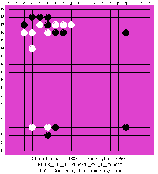 Last move : 1-0 2008 November 10 20:41:40 [Event "FICGS__GO__TOURNAMENT_KYU_I__000010"] [Site "FICGS"] [Date "2008.09.15"] [Round "1"] [Black "Simon,Mickael"] [White "Harris,Cal"] [Result "1-0"] [Rating 1 "1305"] [Rating 2 "0963"] 1.q16 d4 2.q4 d16 3.f17 d14 4.d18 g17 5.g16 h17 6.h16 j17 7.c17 e17 8.e18 f16 9.f18 c16 10.f3 f4 11.g4 1-0 This go game has been lost on time (started : 2008.09.15 10:0:45) Here are the names of the openings (joseki) played in the four corners : Corner d16 : d16 f17 Hoshi (Hwajeom, Seongjeom, Xingwei`) 4-4 Point. The star or hoshi (4-4) point, emphasizing influence at the potential expense of territory. Ikken Kakari (Hankan Keolch'im, Yi Gua`jiao~, 1-Space Low Approach). Black 2 is the standard approach move to the 4-4. Corner d4 : d4 f3 Hoshi (Hwajeom, Seongjeom, Xingwei`) 4-4 Point. The star or hoshi (4-4) point, emphasizing influence at the potential expense of territory. Ikken Kakari (Hankan Keolch'im, Yi Gua`jiao~, 1-Space Low Approach). Black 2 is the standard approach move to the 4-4. Player Black won this Go (weiqi, baduk) game. Follow this game move after move (download)Don't make empty triangles. (Anonymous) The man who strikes first admits that his ideas have given out. (Chinese proverb)