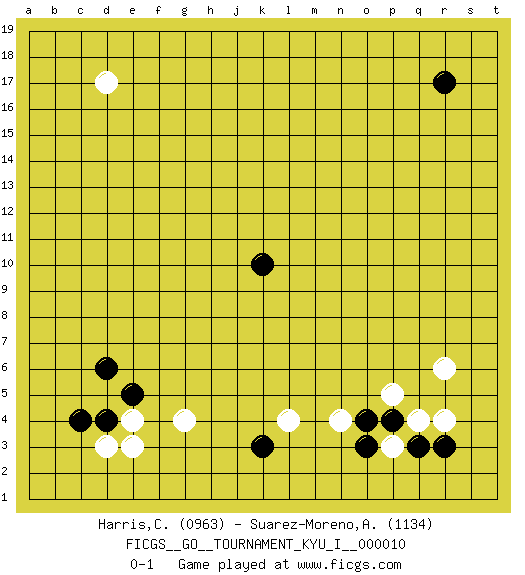 Last move : 0-1 2008 November 10 14:34:13 [Event "FICGS__GO__TOURNAMENT_KYU_I__000010 "] [Site "FICGS"] [Date "2008.09.15"] [Round "1"] [Black "Harris,Cal "] [White "Suarez-Moreno,Alejandro "] [Result "0-1"] [Rating 1 "0963"] [Rating 2 "1134"] 1.k10 e4 2.r17 d17 3.r3 q4 4.k3 n4 5.c4 d3 6.e5 g4 7.d4 e3 8.d6 r6 9.q3 p3 10.p4 r4 11.o3 p5 12.o4 l4 0-1 This go game has been lost on time (started : 2008.09.15 10:0:45) Here are the names of the openings (joseki) played in the four corners : Corner q4 : r3 q4San-San (Sam-Sam, San-San) 3-3 Point. The San-San (3-3) point, emphasizing territory at the expense of influence.Kata-tsuki (shoulder hit). The shoulder-hit is the traditional answer to the 3-3. The direction of Black 3 depends on the positions on the side. Crawling once may be the premise for a follow-up move of sliding with a knight's move in the opposite direction. If Black plays 3 at 3-4 (to the right), the follow-on knight's move is then played at the top (e.g. 3-4, 4-5, 5-2). Black's knight's move reduces territory potential on the side it is played. Corner d4 : e4 c4Takamoku (Gomok, Gaomu`) 5-4 Point. The takamoku (high) point (5-4). With its emphasis on influence, the 5-4 point complements the 4-4 (hoshi) point in creating an influence-oriented fuseki.Komoku. White responds with 3-3, 3-5, 4-6, 4-7, 3-6, 3-7. Player White won this Go (weiqi, baduk) game.Follow this game move after move (download ) Don't make dango's. (Anonymous) Lamb in skin of tiger, still fears the wolf. (Chinese proverb)