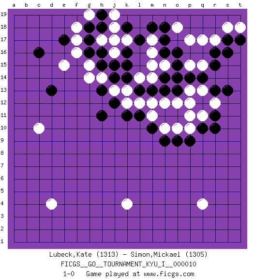 Last move : 1-0 2008 November 14 0:24:7 [Event "FICGS__GO__TOURNAMENT_KYU_I__000010"] [Site "FICGS"] [Date "2008.09.15"] [Round "1"] [Black "Lubeck,Kate"] [White "Simon,Mickael"] [Result "1-0"] [Rating 1 "1313"] [Rating 2 "1305"] 1.r16 d4 2.c16 q4 3.k16 k4 4.e17 c10 5.q10 p17 6.n17 p15 7.q14 m16 8.n16 n15 9.o16 q15 10.r15 m17 11.o15 o14 12.n14 m15 13.p14 q17 14.o13 r17 15.s17 s18 16.s16 o18 17.n18 t18 18.t17 l14 19.j12 e15 20.d13 h17 21.j14 l12 22.k11 m11 23.l11 n12 24.m10 n10 25.n9 o10 26.o9 p10 27.p9 o12 28.m13 m14 29.n13 m12 30.l13 k13 31.k14 j13 32.h13 k12 33.h11 p13 34.o14 q11 35.r10 q13 36.r13 r12 37.s13 p11 38.q12 p12 39.r11 h14 40.l17 j16 41.h15 g14 42.j15 g15 43.h16 j17 44.g16 f16 45.g17 f17 46.g18 f18 47.h18 j18 48.m18 g19 49.h19 j19 50.k15 k17 51.k18 1-0 Here are the names of the openings (joseki) played in the four corners : Corner q16 : r16 p17 Komoku (Somok, Xiao~mu`) 3-4 Point. The komoku (3-4) point is the traditional corner enclosure move.. Ikken Kakari (Hankan Keolch'im, Yi Gua`jiao~, 1-Space Low Pincer). The small knight move is the basic approach move to the 3-4 point stone. It has been continually used for over four centuries. There are limitless variations, with new moves constantly being discovered. White 2 opens the door to a treaure store of joseki. Corner q4 : q4 n9 Hoshi (Hwajeom, Seongjeom, Xingwei`) 4-4 Point. The star or hoshi (4-4) point, emphasizing influence at the potential expense of territory. Player Black won this Go (weiqi, baduk) game. Follow this game move after move (download)The poor player plays the opponent's game for him. (Anonymous) No enterprise is more likely to succeed than one concealed from the enemy until it is ripe for execution. (Niccolo Machiavelli)