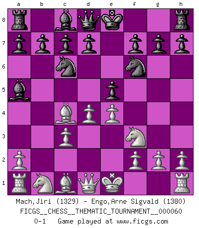 Last move : 0-1 2008 November 3 7:37:19 [Event "FICGS__CHESS__THEMATIC_TOURNAMENT__000060"] [Site "FICGS"] [Date "2008.09.15"] [Round "1"] [White "Mach,Jiri"] [Black "Engo,Arne Sigvald"] [Result "0-1"] [WhiteElo "1329"] [BlackElo "1380"] 1.e4 e5 2.Nf3 Nc6 3.Bc4 Bc5 4.b4 Bxb4 5.c3 Ba5 6.d4 Nf6 0-1 This chess game has been lost on time (started : 2008.09.15 14:40:23) Evans gambit Player Black won this chess game. Follow this game move after move (download)I don't believe in psychology. I believe in good moves. (Bobby Fischer) Ich suche im Schach immer etwas Eigenes. Riskantes Spiel im Stile schachlicher Musketiere ist nicht meine Sache, auch wenn es vielen Freunden scharfer Wendungen gefällt. (Anatoly Karpov) El Ajedrez tiene tanto misterio como las mujeres. (Purdy) La tactique est l'élément le plus important du milieu de jeu. (Siegbert Tarrasch) Locking firmely the window serves nothing, only small thiefs pass through there, the big thiefs enter through the front door. (Luc-Olivier Leclerc)