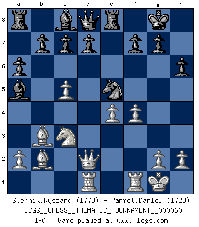 Last move : 1-0 2008 October 9 21:34:2 [Event "FICGS__CHESS__THEMATIC_TOURNAMENT__000060"] [Site "FICGS"] [Date "2008.09.15"] [Round "1"] [White "Sternik,Ryszard"] [Black "Parmet,Daniel"] [Result "1-0"] [WhiteElo "1778"] [BlackElo "1728"] 1.e4 e5 2.Nf3 Nc6 3.Bc4 Bc5 4.b4 Bxb4 5.c3 Ba5 6.d4 Bb6 7.dxe5 Nge7 8.Ba3 O-O 9.O-O h6 10.Qd2 Na5 11.Bb3 Re8 12.c4 a6 13.Nc3 Nac6 14.c5 Ba5 15.Bb2 Ng6 16.Rad1 Ncxe5 17.Nxe5 Nxe5 18.f4 1-0 Evans gambit Kingside Castling by player Black (move 8) Kingside Castling by player White (move 9) Player White won this chess game. Follow this game move after move (download)The sign of a great Master is his ability to win a won game quickly and painlessly. (Irving Chernev) Eine Person mit durchschnittlichem IQ kann etwa eine ELO von 2000 erreichen. (Jonathan Levitt) En el Ajedrez, tal como es jugado por los Maestros, practicamente la suerte es eliminada. (Emanuel Lasker) Les échecs sont un jeu par leur forme, un art par leur essence et une science par sa difficulté d'acquisition. Ils peuvent vous procurer autant de plaisir qu'un bon livre ou une belle musique, mais vous n'aurez une réelle joie que si vous arrivez à bien jouer. (Tigran Petrosian) The man who strikes first admits that his ideas have given out. (Chinese proverb)