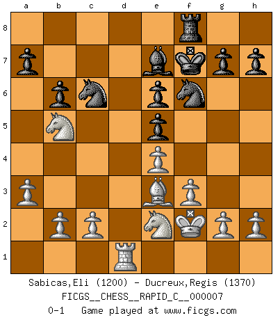Last move : 0-1 2006 October 9 11:47:30 [Event "FICGS__CHESS__RAPID_C__000007"] [Site "FICGS"] [Date "2006.08.12"] [Round "1"] [White "Sabicas,Eli"] [Black "Ducreux,Regis"] [Result "0-1"] [WhiteElo "1200"] [BlackElo "1370"] 1.e4 d6 2.d4 Nf6 3.f3 Bd7 4.Be3 e5 5.dxe5 dxe5 6.Bc4 Be7 7.Ne2 O-O 8.O-O Be6 9.Bxe6 fxe6 10.Nbc3 Nc6 11.a3 Qxd1 12.Raxd1 Rad8 13.Kf2 Rxd1 14.Rxd1 Na5 15.Nb5 b6 16.Nxc7 Kf7 17.Nb5 Nc6 0-1 This chess game has been lost on time (started : 2006.08.12 9:4:43) King's pawn Opening Kingside Castling by player Black (move 7) Kingside Castling by player White (move 8) Player Black won this chess game. Follow this game move after move (download)Any material change in a position must come about by mate, a capture, or a Pawn promotion. (Purdy) Die Jungen erwarten, dass Opa einfach umfällt. Dann aber kann Opa fünf Stunden lang Schach spielen und die jungen Gegner an die Wand drücken. (Viktor Kortschnoi) Morphy probablemente fue el genio más grande de todos. (Bobby Fischer) Le temps de noter son nom sur la feuille de partie, j'étais déjà en zeitnot ! D'un modeste amateur apparié lors de la première ronde d'un open contre le grand-maître Azmaïparashvili. The question of whether computers can think is just like question of whether submarines can swim. (Edsger W. Dijkstra)