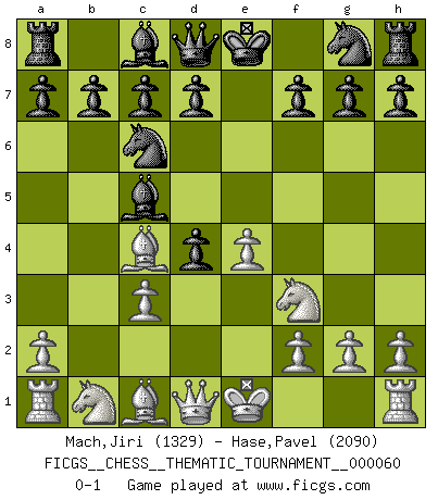 Last move : 0-1 2008 November 2 7:35:35 [Event "FICGS__CHESS__THEMATIC_TOURNAMENT__000060"] [Site "FICGS"] [Date "2008.09.15"] [Round "1"] [White "Mach,Jiri"] [Black "Hase,Pavel"] [Result "0-1"] [WhiteElo "1329"] [BlackElo "2090"] 1.e4 e5 2.Nf3 Nc6 3.Bc4 Bc5 4.b4 Nxb4 5.c3 Nc6 6.d4 exd4 0-1 This chess game has been lost on time (started : 2008.09.15 14:40:23) Evans gambit declined Player Black won this chess game. Follow this game move after move (download)All Chess players should have a hobby. (Savielly Tartakower) Wie bekannt hörte Morphy 1859 auf, Schach zu spielen. Seine Enttäuschung galt nicht so sehr dem Schach, wie den Schachspielern. (Robert James Fischer) La única cosa que los jugadores de Ajedrez tienen en común, es el Ajedrez. (Lodewijk Prins) Plusieurs personnes se sont demandées comment Tal faisait pour gagner... En fait, c'est très simple ! Il met ses pièces au centre de l'échiquier et les sacrifie quelque part ! (David Bronstein) To err is human, to shift the blame on someone else is tactical. (Mladen Jankovic)