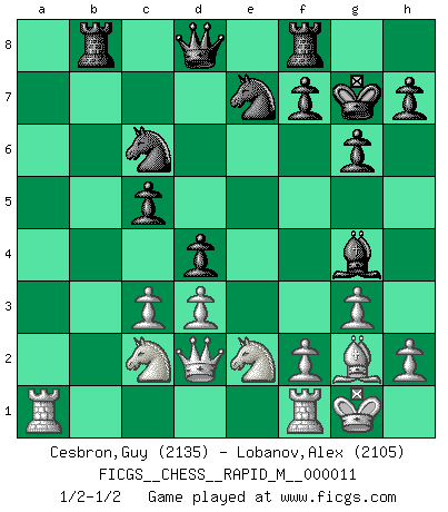 Last move : 1/2-1/2 2008 November 15 0:24:2 [Event "FICGS__CHESS__RAPID_M__000011"] [Site "FICGS"] [Date "2008.09.16"] [Round "1"] [White "Cesbron,Guy"] [Black "Lobanov,Alex"] [Result "1/2-1/2"] [WhiteElo "2135"] [BlackElo "2105"] 1.e4 c5 2.Nc3 Nc6 3.g3 d6 4.Bg2 g6 5.d3 Bg7 6.Be3 Rb8 7.Qd2 b5 8.Nge2 b4 9.Nd1 Nd4 10.O-O e6 11.Nc1 Ne7 12.a3 a5 13.axb4 axb4 14.c3 bxc3 15.bxc3 Ndc6 16.Bh6 O-O 17.Bxg7 Kxg7 18.Ne3 d5 19.exd5 exd5 20.Ne2 d4 21.Nc2 Bg4 1/2-1/2 Sicilian : Closed Kingside Castling by player White (move 10) Kingside Castling by player Black (move 16) This chess game ended in a draw. Follow this game move after move (download)Chess is no whit inferior to the violin, and we have a large number of professional violinists. (Mikhail Botvinnik) Gewöhnliche Menschen denken nur daran, wie sie ihre Zeit verbringen. Ein intelligenter Mensch versucht, sie auszunutzen. (Arthur Schopenhauer) En un gambito tu regalas un Peón por el bién de tomar un juego perdido. (Samuel Standige Boden) Celui qui prend des risques peut perdre, celui qui n'en prend pas perd toujours. (Xavier Tartacover) It is a good thing for an uneducated man to read books of quotations. (Winston Churchill)
