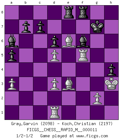Last move : 1/2-1/2 2008 December 4 20:21:39 [Event "FICGS__CHESS__RAPID_M__000011"] [Site "FICGS"] [Date "2008.09.16"] [Round "1"] [White "Gray,Garvin"] [Black "Koch,Christian"] [Result "1/2-1/2"] [WhiteElo "2098"] [BlackElo "2197"] 1.e4 e5 2.f4 exf4 3.Nf3 g5 4.h4 g4 5.Ne5 Qe7 6.d4 d6 7.Nxg4 Qxe4+ 8.Qe2 Qe7 9.Qxe7+ Bxe7 10.Be2 h5 11.Nf2 Nh6 12.d5 Na6 13.Nd3 Nf5 14.Bxf4 Nxh4 15.Kf2 Bf5 16.Nc3 Ng6 17.Be3 Ne5 18.Raf1 Nxd3+ 19.cxd3 h4 20.Kg1 Bd7 21.a3 Nc5 22.b4 Na4 23.Nxa4 Bxa4 24.Rf4 a5 25.Kh2 Bd7 26.Rc1 Bd8 27.b5 Bxb5 28.Rb1 Ba6 29.Bg4 O-O 30.Bd7 f5 31.Rxf5 Bf6 32.Rd1 Kg7 33.Kh3 Rad8 34.Be6 Rde8 1/2-1/2 KGA : Kieseritsky, Salvio (Rosenthal) defense Kingside Castling by player Black (move 29) This chess game ended in a draw. Follow this game move after move (download)Only sissies Castle. (Rob Sillars) Im Fernschach kannst du während dem Spiel rauchen. (John Christen Knudsen) La única cosa que los jugadores de Ajedrez tienen en común, es el Ajedrez. (Lodewijk Prins) Des combinaisons [dans le jeu d'échecs] pareilles à des mélodies. Je crois entendre pour ainsi dire la musique des coups... (Vladimir Nabokov) Always be a first-rate version of yourself, instead of a second-rate version of somebody else. (Judy Garland)