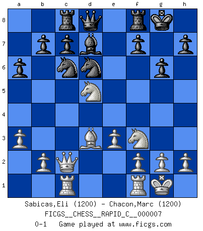 Last move : 0-1 2006 October 6 5:5:16 [Event "FICGS__CHESS__RAPID_C__000007"] [Site "FICGS"] [Date "2006.08.12"] [Round "1"] [White "Sabicas,Eli"] [Black "Chacon,Marc"] [Result "0-1"] [WhiteElo "1200"] [BlackElo "1200"] 1.d4 d5 2.c4 e6 3.Nf3 Nf6 4.Bg5 dxc4 5.Qa4+ Bd7 6.Qxc4 Be7 7.e3 Nc6 8.a3 Ne4 9.Bxe7 Qxe7 10.Bd3 Nd6 11.Qc2 O-O 12.Nc3 a6 13.O-O g6 14.d5 exd5 15.Nxd5 Qd8 16.Rac1 Rc8 0-1 This chess game has been lost on time (started : 2006.08.12 9:4:43) QGD Kingside Castling by player Black (move 11) Kingside Castling by player White (move 13) Player Black won this chess game. Follow this game move after move (download)There are tough players and nice guys, and I'm a tough player. (Bobby Fischer) Der beste Spieler in einem Turnier gewinnt es nie. Er landet auf Platz zwei oder drei. (Siegbert Tarrasch) Una mala movida nulifica cuarenta buenas. (Horowitz) On entre au jeu d'Echecs comme on entre en Religion. Pour le joueur d'Echecs, la partie d'Echecs c'est l'office, la messe, le défilé du 1er Mai, le dépôt de gerbe au Monument aux Morts. C'est un drame sacré. (Michel Roos) Memory... is the diary that we all carry with us. (Oscar Wilde, The Importance of Being Earnest)