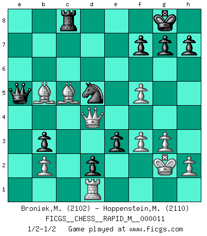 Last move : 1/2-1/2 2008 November 8 9:21:48 [Event "FICGS__CHESS__RAPID_M__000011"] [Site "FICGS"] [Date "2008.09.16"] [Round "1"] [White "Broniek,Mariusz Maciej"] [Black "Hoppenstein,Michael"] [Result "1/2-1/2"] [WhiteElo "2102"] [BlackElo "2110"] 1.e4 c5 2.Nf3 e6 3.d4 cxd4 4.Nxd4 a6 5.Nc3 b5 6.Bd3 d6 7.O-O Nf6 8.Qe2 Be7 9.a4 b4 10.Na2 e5 11.Nf5 Bxf5 12.exf5 a5 13.Bb5+ Nbd7 14.Be3 O-O 15.Rfd1 Rc8 16.c3 d5 17.cxb4 axb4 18.Rac1 Bd6 19.Rxc8 Qxc8 20.Rc1 Qd8 21.Bd2 Nc5 22.Qd1 b3 23.Nb4 Qb6 24.Qe2 d4 25.g3 Rc8 26.Na6 e4 27.Qc4 Bf8 28.a5 Qd8 29.Bb4 d3 30.Nxc5 Bxc5 31.Bxc5 Qxa5 32.Kg2 d2 33.Rd1 e3 34.Qb4 Qa8+ 35.f3 Nd5 36.Qd4 Qa5 1/2-1/2 Sicilian : Kan, 5.Nc3 Kingside Castling by player White (move 7) Kingside Castling by player Black (move 14) This chess game ended in a draw. Follow this game move after move (download)Who is your opponent tonight, tonight I am playing against the Black pieces. (Akiba Rubinstein) Fallen sollten polizeilich verboten werden. (Savielly Grigorievitsch Tartakower) El Ajedrez es un mar en el cual un mosquito puede beber y un elefante puede bañarse. (Refrán Hindú) Avec des compensations pour le matériel en plus... (Anonyme) Kids, you tried your best and you failed miserably. The lesson is, never try. (Simpsons)
