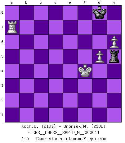 Last move : 1-0 2009 March 1 17:32:49 [Event "FICGS__CHESS__RAPID_M__000011"] [Site "FICGS"] [Date "2008.09.16"] [Round "1"] [White "Koch,Christian"] [Black "Broniek,Mariusz Maciej"] [Result "1-0"] [WhiteElo "2197"] [BlackElo "2102"] 1.d4 d5 2.c4 dxc4 3.Nf3 Nf6 4.e3 Bg4 5.Bxc4 e6 6.h3 Bh5 7.Qb3 Qc8 8.Nc3 Nc6 9.Be2 Be7 10.O-O O-O 11.Rd1 Rd8 12.g4 Bg6 13.Nh4 a5 14.Nxg6 hxg6 15.a3 Qd7 16.Bd2 a4 17.Qc2 Nd5 18.Bf3 Nb6 19.Ne2 Nd5 20.Rac1 g5 21.Bh1 Bf6 22.Nc3 g6 23.Bg2 Kg7 24.Ne4 Be7 25.Nc3 Bf6 26.Bf3 Be7 27.Kg2 Kg8 28.Be1 Bf6 29.Qd3 Na7 30.Qc4 Nxc3 31.Bxc3 Nb5 32.Bxb7 Nd6 33.Qc6 Nxb7 34.Qxb7 Rab8 35.Qe4 Be7 36.d5 exd5 37.Qd4 f6 38.e4 Kf7 39.exd5 c6 40.d6 Qxd6 41.Qxa4 Qe6 42.Rxd8 Rxd8 43.Rd1 Rd5 44.Re1 Qd7 45.Qc4 Kg7 46.a4 Bd8 47.Qb4 Kf7 48.Qb8 Qd6 49.Qxd6 Rxd6 50.b4 Be7 51.Re4 Rd1 52.Rc4 Rc1 53.Rxc6 Bxb4 54.Rxf6+ Ke7 55.Be5 Re1 56.Rb6 Rxe5 57.Rxb4 Ra5 58.f4 gxf4 59.h4 g5 60.h5 Rc5 61.Rb5 Rc2+ 62.Kf1 Rc1+ 63.Ke2 Rc2+ 64.Kd3 Ra2 65.Rxg5 f3 66.Rf5 Rxa4 67.g5 Rh4 68.h6 Rh5 69.Ke3 Ke6 70.Rf6+ Ke7 71.Rg6 Rh3 72.Rc6 Kf8 73.Rf6+ Kg8 74.Rxf3 Rh4 75.Rf6 Kh7 76.Kf3 Rh2 77.Rf7+ Kg8 78.Ra7 Rh4 79.Kg3 Rh5 80.Kf4 1-0 QGA, Janowsky-Larsen variation Kingside Castling by player White (move 10) Kingside Castling by player Black (move 10) 10 pieces endgame at move 57 : White KRPPPP , Black KRPP WHITE : King + 1 Rook 4 Pawns BLACK : King + 1 Rook 2 Pawns 9 pieces endgame at move 58 : White KRPPP , Black KRPP WHITE : King + 1 Rook 3 Pawns BLACK : King + 1 Rook 2 Pawns 8 pieces endgame at move 65 : White KRPPP , Black KRP WHITE : King + 1 Rook 3 Pawns BLACK : King + 1 Rook 1 Pawn 7 pieces endgame at move 66 : White KRPP , Black KRP WHITE : King + 1 Rook 2 Pawns BLACK : King + 1 Rook 1 Pawn 6 pieces endgame at move 74 : White KRPP , Black KR WHITE : King + 1 Rook 2 Pawns BLACK : King + 1 Rook Player White won this chess game. Follow this game move after move (download)Let the perfectionist play postal. (Yasser Seirawan) Ohne ihre Erfolge schmälern zu wollen würde ich sagen Petrosian, Spassky und Karpov verdanken ihre Siege ihren Trainern - Boleslavsky, Bondarevsky und Furman. (Mikhail Moiseyevich Botvinik) ¿Cual es el objetivo de jugar una apertura de gambito?... Para adquirir una reputación de ser un jugador apuesto a costo de perder el juego. (Siegbert Tarrasch) L'action d'une oeuvre littéraire se déroule sur un champ de bataille. Les masques et les types du drame moderne correspondent aux pièces du jeu d'échecs. L'intrigue correspond aux coups et aux gambits, c'est à dire aux techniques du jeu telles qu'utilisées et interprétées par les joueurs. Les tactiques et les péripéties [mouvements] correspondent aux coups exécutés par l'adversaire. (Viktor Shklovsky) It's not the will to win, but the will to prepare to win that makes the difference. (Bear Bryant)