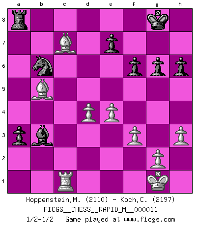 Last move : 1/2-1/2 2008 November 1 12:12:2 [Event "FICGS__CHESS__RAPID_M__000011"] [Site "FICGS"] [Date "2008.09.16"] [Round "1"] [White "Hoppenstein,Michael"] [Black "Koch,Christian"] [Result "1/2-1/2"] [WhiteElo "2110"] [BlackElo "2197"] 1.d4 d5 2.c4 c6 3.Nf3 Nf6 4.Qc2 g6 5.Bf4 Bf5 6.Qb3 Qb6 7.e3 Bg7 8.Nc3 O-O 9.Be2 Nbd7 10.h3 dxc4 11.Bxc4 Ne4 12.O-O Nxc3 13.bxc3 Qxb3 14.Bxb3 h6 15.Bh2 a5 16.a4 b5 17.axb5 cxb5 18.Bd5 Ra7 19.Bc6 Rc8 20.Bxb5 Rxc3 21.Rfe1 Nb6 22.Ne5 Bxe5 23.Bxe5 f6 24.Bb8 Ra8 25.Bf4 Be4 26.Rec1 Rxc1+ 27.Rxc1 a4 28.f3 Bd5 29.e4 Bb3 30.Bc7 a3 1/2-1/2 QGD Slav : 3.Nf3 Kingside Castling by player Black (move 8) Kingside Castling by player White (move 12) This chess game ended in a draw. Follow this game move after move (download)A strong memory, concentration, imagination, and a strong will is required to become a great Chess player. (Bobby Fischer) Sie bekommen vielleicht den Eindruck, dass die Spitzenspieler überhaupt gar nicht so stark sind. Aber das stimmt nicht. Es ist eine Illusion. Mit einem Computer an der Seite ist es sehr leicht, Urteile zu fällen, aber wenn man alleine am Brett sitzt, sieht die Sache ganz anders aus. (Vladimir Kramnik) Aunque la mayoría de la gente disfruta observar las partidas de los grandes Maestros de ataque, algunos de los jugadores mas notables en la historia han sido los jugadores silenciosos posicionales. Lentamente ellos te aplastan despojandote de tu espacio, congestionando tus piezas y dejandote virtualmente sin nada que hacer. (Yasser Seirawan) Mais n'est-ce pas déjà le limiter injurieusement que d'appeler les échecs un jeu? N'est-ce pas aussi une science, un art, ou quelque chose qui, comme le cercueil de Mahomet entre ciel et terre, est suspendu entre l'un et l'autre, et qui réunit un nombre incroyable de contraires ? (Stefan Zweig) Computers have lots of memory but no imagination. (Anonymous)