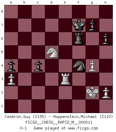 Last move : 0-1 2008 December 22 22:55:35 [Event "FICGS__CHESS__RAPID_M__000011"] [Site "FICGS"] [Date "2008.09.16"] [Round "1"] [White "Cesbron,Guy"] [Black "Hoppenstein,Michael"] [Result "0-1"] [WhiteElo "2135"] [BlackElo "2110"] 1.e4 c5 2.Nc3 a6 3.g3 b5 4.Bg2 Bb7 5.d3 e6 6.Nf3 d6 7.O-O Nd7 8.Ng5 Be7 9.f4 b4 10.Ne2 h6 11.Nh3 Ngf6 12.Nf2 Qc7 13.Be3 O-O 14.c3 a5 15.Qc2 Rfe8 16.a3 bxc3 17.bxc3 c4 18.d4 Rab8 19.Rab1 Bc6 20.g4 d5 21.e5 Nh7 22.Qa2 a4 23.Rxb8 Rxb8 24.Ra1 Ndf8 25.f5 Rb3 26.Bc1 f6 27.Qc2 fxe5 28.dxe5 Bc5 29.Nd4 Qxe5 30.Nxc6 Qe1+ 31.Bf1 Ng5 32.Kg2 Nf3 33.fxe6 Nxe6 34.Qe2 Rxc3 35.Qxe1 Nxe1+ 36.Kh1 Rc2 37.Be3 Bxe3 38.Rxe1 Rxf2 39.Rxe3 Rxf1+ 40.Kg2 Rf6 41.Ne7+ Kf7 42.Nxd5 Nf4+ 0-1 Sicilian : Closed Kingside Castling by player White (move 7) Kingside Castling by player Black (move 13) Player Black won this chess game. Follow this game move after move (download)You cannot play at Chess if you are kind-hearted. (French Proverb) Die Leute spielen gegen mich seit 15 Jahren unter Ihren Möglichkeiten. (Robert James Fischer) El Ajedrez es imaginación. (David Bronstein) Vous m'avez demandé de vous exposer quel est le fondement de la prière. Je ne fais que préparer les pièces du jeu sur la table... Nous sera-t-il permis d'en adopter les règles et si nous les appliquons scrupuleusement nous ne tarderons pas à faire mat le Roi divin ! Il ne pourra échapper à nos mains. (Sainte Thérèse d'Avila, Chemin de perfection) A clear conscience is usually the sign of a bad memory. (Unknown)