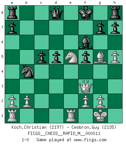 Last move : 1-0 2008 November 2 12:59:46 [Event "FICGS__CHESS__RAPID_M__000011"] [Site "FICGS"] [Date "2008.09.16"] [Round "1"] [White "Koch,Christian"] [Black "Cesbron,Guy"] [Result "1-0"] [WhiteElo "2197"] [BlackElo "2135"] 1.e4 e6 2.d4 d5 3.Nc3 Bb4 4.e5 Bf8 5.Nf3 b6 6.Bd3 Ba6 7.Ne2 Qd7 8.O-O c5 9.dxc5 bxc5 10.Bxa6 Nxa6 11.c4 Ne7 12.Ng3 Ng6 13.cxd5 exd5 14.h4 Be7 15.e6 fxe6 16.h5 Nh4 17.Ne5 Qc8 18.Qa4+ Kf8 19.Qf4+ Nf5 20.Nxf5 exf5 21.Re1 Bf6 22.Qf3 Nb4 23.Bf4 Qd8 24.Bg5 1-0 French : Winawer, Advance variation Kingside Castling by player White (move 8) Player White won this chess game. Follow this game move after move (download)Avoid the crowd. Do your own thinking independently. Be the Chess player, not the Chess piece. (Ralph Charell) Eine Person mit durchschnittlichem IQ kann etwa eine ELO von 2000 erreichen. (Jonathan Levitt) En el Ajedrez, tal como es jugado por los Maestros, practicamente la suerte es eliminada. (Emanuel Lasker) Les écrivains ont utilisé les échecs pour analyser les côtés extrêmes de la nature humaine. Dans ce cadre, les échecs offrent un champ d'expérimentation idéal. Mais on pourrait faire la même chose avec la peinture. Et là, en vous référant à Van Gogh, vous ne tirerez pas de conclusion définitive sur les peintres. (Gary Kasparov) Chess is as much a mystery as women. (Purdy)