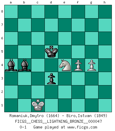 Last move : 0-1 2009 April 8 2:17:13 [Event "FICGS__CHESS__LIGHTNING_BRONZE__000047"] [Site "FICGS"] [Date "2009.04.07"] [Round "1"] [White "Romaniuk,Dmytro"] [Black "Biro,Istvan"] [Result "0-1"] [WhiteElo "1664"] [BlackElo "1849"] 1.d4 c6 2.c4 d5 3.Nf3 Nf6 4.Qc2 g6 5.Bf4 Bf5 6.Qb3 Qb6 7.e3 Na6 8.Be2 Qxb3 9.axb3 Nh5 10.Bg5 Nb4 11.O-O h6 12.Bh4 Bg7 13.Nc3 g5 14.Bg3 Nxg3 15.hxg3 Kd7 16.g4 Bg6 17.Ra5 b6 18.Ra3 e6 19.Rc1 f6 20.Ne1 Bf8 21.Na4 Kc7 22.c5 Be7 23.Rca1 Rab8 24.Bf1 h5 25.gxh5 Rxh5 26.Nc3 bxc5 27.Rxa7+ Rb7 28.Ra8 cxd4 29.exd4 e5 30.dxe5 fxe5 31.Rg8 Rh6 32.Nf3 Kd6 33.R1a8 Bf6 34.g3 e4 35.Nd2 Rbh7 36.Bg2 Rh8 37.Rxh8 Rxh8 38.Rxh8 Bxh8 39.Bxe4 dxe4 40.Ndxe4+ Ke7 41.Nxg5 Bc2 42.Kf1 Nd3 43.b4 Nxb2 44.Nge4 Bd3+ 45.Ke1 Bc4 46.Kd2 Nd3 47.f4 Nxb4 48.g4 Nd5 49.Nxd5+ cxd5 50.Ng3 Ke6 51.Ke3 d4+ 52.Kd2 Bg7 53.Nf5 Bf6 54.Ke1 Bd3 55.Ng3 Be7 56.Kd2 Bc4 57.Ne4 Bb4+ 58.Kc2 d3+ 59.Kc1 Bb3 60.Kb2 Ba4 61.Kc1 Kd5 0-1 This chess game has been lost on time (started : 2009.04.07 13:11:39) Queen's pawn Kingside Castling by player White (move 11) 10 pieces endgame at move 47 : White KNNPP , Black KBBNP WHITE : King + 2 Knights 2 Pawns BLACK : King + 2 Bishops 1 Knight 1 Pawn 9 pieces endgame at move 49 : White KNNPP , Black KBBP WHITE : King + 2 Knights 2 Pawns BLACK : King + 2 Bishops 1 Pawn 8 pieces endgame at move 49 : White KNPP , Black KBBP WHITE : King + 1 Knight 2 Pawns BLACK : King + 2 Bishops 1 Pawn Player Black won this chess game. Follow this game move after move (download)Best by test: 1. e4 (Bobby Fischer) Ein unbeabsichtigtes Patt ist der Gipfel der Dummheit. (Anonymous) La señal de un Gran Maestro es su habilidad de ganar una partida rápidamente y sin dolor. (Irving Chernev) Les ravages du H expliquent la différence de niveau entre Tal et Thal [Abergel]. Wisdom is the reward you get for a lifetime of listening when you'd have preferred to talk. (Doug Larson)
