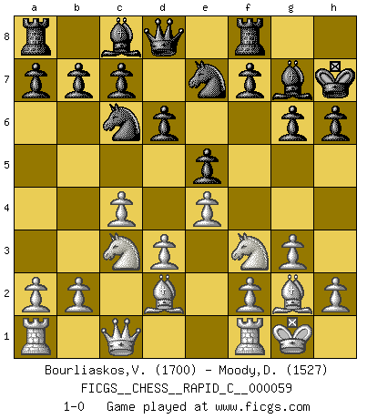 Last move : 1-0 2008 November 1 20:21:25 [Event "FICGS__CHESS__RAPID_C__000059"] [Site "FICGS"] [Date "2008.09.16"] [Round "1"] [White "Bourliaskos,Vassilis"] [Black "Moody,David"] [Result "1-0"] [WhiteElo "1700"] [BlackElo "1527"] 1.c4 g6 2.Nc3 Bg7 3.Nf3 e5 4.d3 Ne7 5.g3 Nbc6 6.Bg2 O-O 7.O-O d6 8.Bd2 h6 9.Qc1 Kh7 10.e4 1-0 English Opening Kingside Castling by player Black (move 6) Kingside Castling by player White (move 7) Player White won this chess game. Follow this game move after move (download)Chess is a foolish expedient for making idle people believe they are doing something very clever when they are only wasting their time. (George Bernard Shaw) Später, ... hatte ich zunehmend Erfolg in entscheidenden Partien. Vielleicht weil ich eine einfache Wahrheit erkannte: nicht nur ich hatte Angst, auch mein Gegner. (Mikhail Nekhemyevich Tal) En el Ajedrez, tal como en la vida, las bendiciones de hoy pueden ser el veneno del mañana. (Assaic) Les réformistes prétendent que les progrès de la théorie conduiront à la disparition des échecs, et qu'il faut, pour leur rendre vie, en remanier les règles. En réalité, qu'exprime cette affirmation? Le mépris de l'intuition, de l'imagination et de tous les autres éléments qui font des échecs un art. (Alexander Alekhine) May the force be with you. (Han Solo in Star Wars ep.4)