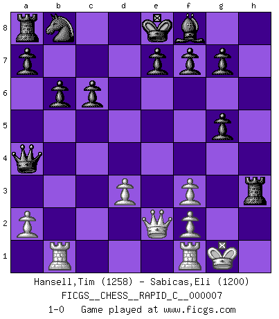 Last move : 1-0 2006 October 7 5:8:8 [Event "FICGS__CHESS__RAPID_C__000007"] [Site "FICGS"] [Date "2006.08.12"] [Round "1"] [White "Hansell,Tim"] [Black "Sabicas,Eli"] [Result "1-0"] [WhiteElo "1258"] [BlackElo "1200"] 1.e4 Nf6 2.Nf3 Nxe4 3.Bc4 d5 4.Bb5+ c6 5.Ba4 Bg4 6.d3 Qa5+ 7.Nc3 Nxc3 8.bxc3 Qxa4 9.Rb1 b6 10.Bg5 h6 11.c4 hxg5 12.h3 Bxf3 13.gxf3 dxc4 14.O-O Rxh3 15.Qe2 cxd3 16.cxd3 1-0 This chess game has been lost on time (started : 2006.08.12 9:4:43) Alekhine's defense Kingside Castling by player White (move 14) Player White won this chess game. Follow this game move after move (download)When your house is on fire, you can't be bothered with the neighbors. Or, as we say in Chess, if your King is under attack you don't worry about losing a Pawn on the Queen's side. (Gary Kasparov) Kritik überlasse ich den Spießern. Ich zeige nichts, wofür ich mich schämen muss. (Alexandra Kosteniuk) El Ajedrez expande y enriquece tu mente. (Saudin Robovic) À la honte des hommes, on sait que les lois du jeu sont les seules qui soient partout justes, claires, inviolables et exécutées. Pourquoi l'Indien qui a donné les règles du jeu d'échecs est-il obéi de bon gré dans toute la terre, et que les décrétales des papes, par exemple, sont aujourd'hui un objet d'horreur et de mépris ? C'est que l'inventeur des échecs combina tout avec justesse pour la satisfaction des joueurs, et que les papes, dans leurs décrétales, n'eurent en vue que leur seul avantage. L'Indien voulut exercer également l'esprit des hommes et leur donner du plaisir; les papes ont voulu abrutir l'esprit des hommes. Voltaire (Dictionnaire philosophique / Garnier 1967) All the troubles of the world come from being unable to sit alone in a quiet room. (Blaise Pascal)