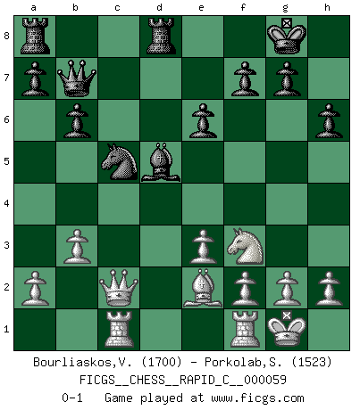 Last move : 0-1 2008 December 20 15:5:59 [Event "FICGS__CHESS__RAPID_C__000059"] [Site "FICGS"] [Date "2008.09.16"] [Round "1"] [White "Bourliaskos,Vassilis"] [Black "Porkolab,Sandor"] [Result "0-1"] [WhiteElo "1700"] [BlackElo "1523"] 1.d4 Nf6 2.c4 e6 3.Nf3 d5 4.Bg5 Be7 5.e3 O-O 6.Be2 h6 7.Bh4 b6 8.Nc3 Bb7 9.cxd5 Nxd5 10.Bxe7 Qxe7 11.Nxd5 Bxd5 12.O-O Nd7 13.b3 c5 14.dxc5 Nxc5 15.Rc1 Rfd8 16.Qc2 Qb7 0-1 This chess game has been lost on time (started : 2008.09.16 18:23:50) Queen's pawn game Kingside Castling by player Black (move 5) Kingside Castling by player White (move 12) Player Black won this chess game. Follow this game move after move (download)I play correspondence chess because it is both art and science while chess is art only. (A player at FICGS) Die Jungen erwarten, dass Opa einfach umfällt. Dann aber kann Opa fünf Stunden lang Schach spielen und die jungen Gegner an die Wand drücken. (Viktor Kortschnoi) Yo adoro todas la posiciones. Denme una partida posicional difícil, y la jugaré. Pero posiciones totalmente ganadas, no las tolero. (Hein Donner) Il vaut toujours mieux jouer un plan faux de façon logique que de n'avoir pas de plan du tout. (Victor Kortchnoï) There are two major products that came out of Berkeley: LSD and UNIX. We do not believe this is to be a coincidence. (Jeremy S. Anderson)
