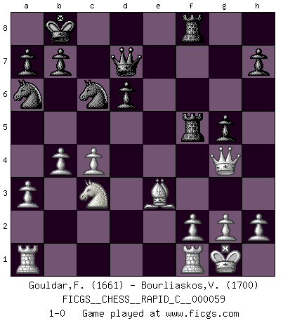 Last move : 1-0 2008 December 11 2:9:52 [Event "FICGS__CHESS__RAPID_C__000059"] [Site "FICGS"] [Date "2008.09.16"] [Round "1"] [White "Gouldar,Frances"] [Black "Bourliaskos,Vassilis"] [Result "1-0"] [WhiteElo "1661"] [BlackElo "1700"] 1.e4 e5 2.Nf3 Nc6 3.Bc4 Nf6 4.Ng5 d5 5.exd5 Na5 6.Bb5+ Bd7 7.Qe2 Bd6 8.O-O Nxd5 9.Bxd7+ Qxd7 10.d4 O-O-O 11.dxe5 Rde8 12.Qf3 Rxe5 13.Nxf7 Rf5 14.Nxd6+ cxd6 15.Qa3 Nc6 16.c4 Ndb4 17.Qc3 Kb8 18.a3 Na6 19.b4 Ne5 20.Be3 Rc8 21.Qd4 Nc6 22.Qh4 g5 23.Qg4 Rcf8 24.Nc3 1-0 This chess game has been lost on time (started : 2008.09.16 18:23:50) Two knights defense Kingside Castling by player White (move 8) Queenside Castling by player Black (move 10) Player White won this chess game. Follow this game move after move (download)If you aren't afraid of Spassky, then I have removed the element of money. (Jim Slater) Wie bekannt hörte Morphy 1859 auf, Schach zu spielen. Seine Enttäuschung galt nicht so sehr dem Schach, wie den Schachspielern. (Robert James Fischer) Bobby solo arroja las piezas y solas caen en las casillas correctas. (Miguel Najdorf ) Les échecs sont plus proches de l'art de l'assassinat que de l'art de la guerre. (Arturo Perez-Reverte) Just because you do not take an interest in politics doesn't mean politics won't take an interest in you. (Pericles 430 B.C.)