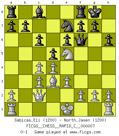 Last move : 0-1 2006 October 10 5:49:31 [Event "FICGS__CHESS__RAPID_C__000007"] [Site "FICGS"] [Date "2006.08.12"] [Round "1"] [White "Sabicas,Eli"] [Black "North,Jasen"] [Result "0-1"] [WhiteElo "1200"] [BlackElo "1200"] 1.c4 Nf6 2.Nf3 e6 3.Nc3 Nc6 4.d4 Bb4 5.Qc2 O-O 6.Bg5 Bxc3+ 7.bxc3 d5 8.e3 h6 9.Bxf6 Qxf6 10.Bd3 Ne7 11.Ne5 c6 0-1 This chess game has been lost on time (started : 2006.08.12 9:4:43) English Opening Kingside Castling by player Black (move 5) Player Black won this chess game. Follow this game move after move (download)First-class players lose to second-class players because second-class players sometimes play a first-class game. (Siegbert Tarrasch) Schach ist Krieg, im Schach geht es um testosterongesteuerte Urschreie. (Garry Kasparov) ¿Cual es el objetivo de jugar una apertura de gambito?... Para adquirir una reputación de ser un jugador apuesto a costo de perder el juego. (Siegbert Tarrasch) Les Echecs ne sont pas pour les âmes timides. Ils requièrent un homme entier, qui ne s'arrête pas aveuglément à ce qui a été déjà établi, mais qui tente individuellement de sonder les profondeurs du jeu. (W. Steinitz) Rules and bones are meant to be broken. (Anonymous)
