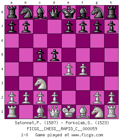 Last move : 1-0 2008 October 19 12:17:45 [Event "FICGS__CHESS__RAPID_C__000059"] [Site "FICGS"] [Date "2008.09.16"] [Round "1"] [White "Satonnet,Patrick"] [Black "Porkolab,Sandor"] [Result "1-0"] [WhiteElo "1587"] [BlackElo "1523"] 1.e4 c5 2.f4 d5 3.Nc3 1-0 This chess game has been lost on time (started : 2008.09.16 18:23:50) Sicilian : Grand Prix attack Player White won this chess game. Follow this game move after move (download)The essence of Chess is thinking about what Chess is. (David Bronstein) Jeder Schachmeister war einmal ein Anfänger. (Irving Chernev) Cuando la partida de Ajedrez termina, el Peón y el Rey regresan a la misma caja. (Irish saying) Aucun coup ne doit être joué sans but. (Pedro Damiano) Programmer - an organism that turns coffee into software. (Anonymous)