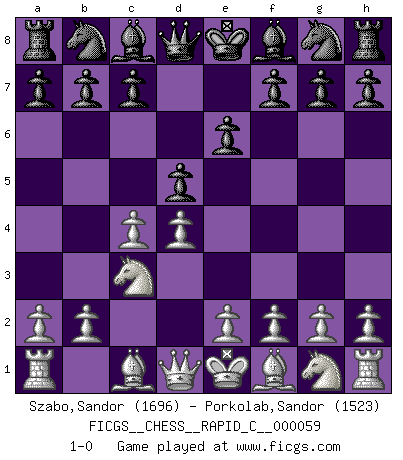 Last move : 1-0 2008 October 22 0:30:8 [Event "FICGS__CHESS__RAPID_C__000059"] [Site "FICGS"] [Date "2008.09.16"] [Round "1"] [White "Szabo,Sandor"] [Black "Porkolab,Sandor"] [Result "1-0"] [WhiteElo "1696"] [BlackElo "1523"] 1.d4 d5 2.c4 e6 3.Nc3 1-0 This chess game has been lost on time (started : 2008.09.16 18:23:50) QGD : 3.Nc3 Player White won this chess game. Follow this game move after move (download)Castle early and often. (Rob Sillars) Der Schachmeister von Heute braucht Courage, einen Killerinstinkt, Ausdauer und Arroganz. (Larry Evans) Las ideas audaces son como las piezas del Ajedrez que avanzan hacia adelante. Ellas pueden ser vencidas, pero también pueden iniciar una partida victoriosa. (Goethe) Il a essayé de se convaincre qu'il pourrait empêcher toutes les erreurs et ne jamais perdre. L'horreur ! Gary Kasparov au sujet de Robert Fischer. There are two types of people in this world, good and bad. The good sleep better, but the bad seem to enjoy the waking hours much more. (Woody Allen)