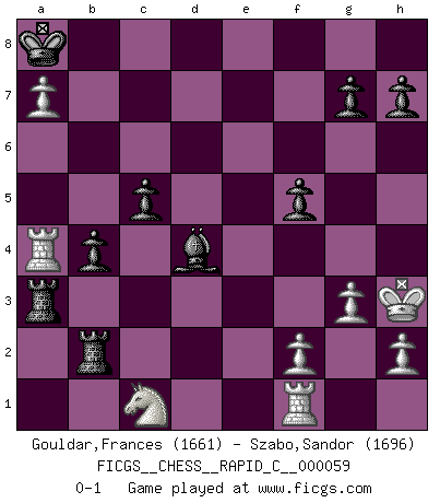Last move : 0-1 2009 February 1 23:29:53 [Event "FICGS__CHESS__RAPID_C__000059"] [Site "FICGS"] [Date "2008.09.16"] [Round "1"] [White "Gouldar,Frances"] [Black "Szabo,Sandor"] [Result "0-1"] [WhiteElo "1661"] [BlackElo "1696"] 1.e4 e5 2.Nf3 Nf6 3.d4 exd4 4.e5 Ne4 5.Qxd4 d5 6.exd6 Nxd6 7.Bd3 Nc6 8.Qe3+ Qe7 9.O-O Qxe3 10.Bxe3 Bf5 11.Bxf5 Nxf5 12.Bf4 O-O-O 13.Ne5 Nxe5 14.Bxe5 Bc5 15.Nc3 Rhe8 16.Bf4 Nd4 17.Be3 Bb4 18.Bxd4 Rxd4 19.Nb5 Rd2 20.Nxa7+ Kb8 21.Nb5 Bc5 22.c3 Rxb2 23.Nd4 Re4 24.Nb3 Bb6 25.g3 Rc4 26.Kg2 Rxc3 27.Nc1 f5 28.a4 Bd4 29.a5 c5 30.a6 b5 31.a7+ Ka8 32.Kh3 b4 33.Ra4 Ra3 0-1 Petrov : Modern attack, Main line Kingside Castling by player White (move 9) Queenside Castling by player Black (move 12) Player Black won this chess game. Follow this game move after move (download)With or without the title, Bobby Fischer was unquestionably the greatest player of his time. (Burt Hochberg) Ich kenne Menschen, die allen Willen der Welt besitzen und doch nicht Schach spielen können. (Robert James Fischer) Una partida de Ajedrez se divide en 3 etapas: la primera cuando piensas que tienes la ventaja, la segunda cuando crees que tienes la ventaja y la tercera... ¡cuando te das cuenta que vas a perder!. (Savielly Tartakower) Pour se monter efficace, un Cavalier a besoin d'avant-postes ! Les Cavaliers font les meilleurs bloqueurs de pions passés. There's no money in correspondence chess. (John Knudsen)