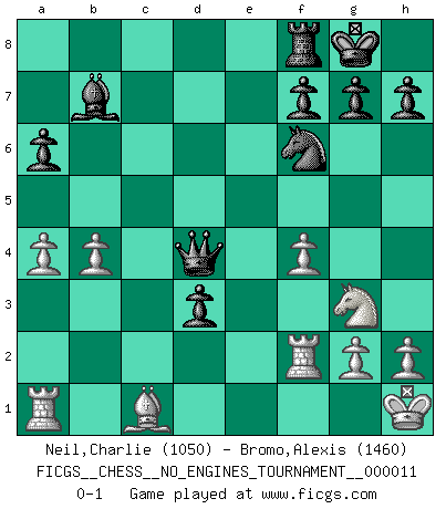 Last move : 0-1 2008 October 19 22:24:10 [Event "FICGS__CHESS__NO_ENGINES_TOURNAMENT__000011"] [Site "FICGS"] [Date "2008.09.17"] [Round "1"] [White "Neil,Charlie"] [Black "Bromo,Alexis"] [Result "0-1"] [WhiteElo "1050"] [BlackElo "1460"] 1.e4 c5 2.Nc3 e6 3.f4 Nc6 4.Nf3 d5 5.exd5 exd5 6.d4 Nf6 7.Bb5 a6 8.Bxc6+ bxc6 9.O-O cxd4 10.Nxd4 Bc5 11.Kh1 O-O 12.Nxc6 Qd6 13.Na5 Bb6 14.Nb3 Bb7 15.Nd4 Bxd4 16.Qxd4 Rac8 17.a4 Rc4 18.Qf2 d4 19.Ne2 Rxc2 20.b4 d3 21.Ng3 Rxf2 22.Rxf2 Qd4 0-1 Sicilian : Closed Kingside Castling by player White (move 9) Kingside Castling by player Black (move 11) Player Black won this chess game. Follow this game move after move (download)Bobby Fischer is the greatest Chess player who has ever lived. (Ken Smith) Wenn Du nicht kämpfst, um anderen etwas zu beweisen, sondern nur für Dich selbst, dann bist du fast unbesiegbar. (Garry Kasparov) Alguna parte de un error es siempre correcto. (Savielly Tartakover) Lorsque vous vous retrouvez devant une position atroce, ne tendez pas un ultime piège dérisoire avec l'intention d'abandonner si l'adversaire le déjoue ! Faites-vous plutôt un devoir de résister comme si votre vie en dépendait. Jouez le coup qui vous déplairait au centuple si vous étiez dans la peau de votre tortionnaire ! If you work for a living, why do you kill yourself working ? (Tuco to a chicken in The Good, The Bad and The Ugly)