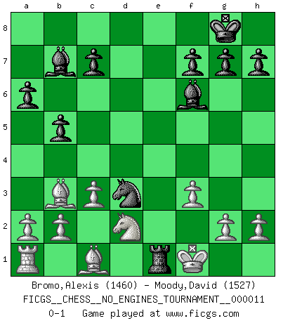 Last move : 0-1 2008 October 2 7:26:55 [Event "FICGS__CHESS__NO_ENGINES_TOURNAMENT__000011"] [Site "FICGS"] [Date "2008.09.17"] [Round "1"] [White "Bromo,Alexis"] [Black "Moody,David"] [Result "0-1"] [WhiteElo "1460"] [BlackElo "1527"] 1.e4 e5 2.Nf3 Nc6 3.Bb5 a6 4.Ba4 Nf6 5.O-O Be7 6.Re1 b5 7.Bb3 O-O 8.c3 d5 9.exd5 Nxd5 10.d4 exd4 11.Nxd4 Nxd4 12.Qxd4 Bb7 13.Nd2 Bf6 14.Qd3 Nf4 15.Qxd8 Raxd8 16.f3 Nd3 17.Re2 Rfe8 18.Rxe8+ Rxe8 19.Kf1 Re1+ 0-1 Ruy Lopez : Closed, 7...O-O Kingside Castling by player White (move 5) Kingside Castling by player Black (move 7) Player Black won this chess game. Follow this game move after move (download)Checkers is for tramps. (Paul Morphy) Weshalb minderdergeübte Spieler mit g2-g4 beginnen? Die betreffenden sind unschlüssig, ob sie nun rechts (h4) oder links (f4) beginnen sollen, und in ihrer Ratlosigkeit entschliessen sie sich nach guter Bürgerart dazu, den goldenen Mittelweg zu wählen. (Aaron Nimzowitsch) Del Ajedrez se ha dicho que la vida no es lo suficientemente larga para él, pero eso es culpa de la vida, no del Ajedrez. (William Ewart Napier) L'ordinateur a tué l'originalité. Il n'y a plus guère d'aventures sur l'échiquier. (Jacob Murray) Perhaps chess is the wrong game for the times (The Chess Master and the Computer, by Garry Kasparov - 2010)