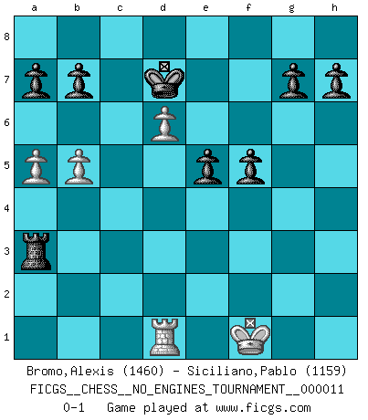 Last move : 0-1 2008 October 24 6:53:3 [Event "FICGS__CHESS__NO_ENGINES_TOURNAMENT__000011"] [Site "FICGS"] [Date "2008.09.17"] [Round "1"] [White "Bromo,Alexis"] [Black "Siciliano,Pablo"] [Result "0-1"] [WhiteElo "1460"] [BlackElo "1159"] 1.e4 c5 2.Nf3 e6 3.d4 cxd4 4.Nxd4 Bc5 5.Be3 Qb6 6.b3 Nc6 7.c3 Nf6 8.f3 d5 9.b4 Bxd4 10.Bxd4 Nxd4 11.Qxd4 Qxd4 12.cxd4 dxe4 13.fxe4 Nxe4 14.Bb5+ Bd7 15.Bxd7+ Kxd7 16.O-O Ke7 17.Rd1 Rhd8 18.a4 Rac8 19.Kf1 Rc2 20.Na3 Rb2 21.b5 Rd5 22.Nc4 Rf2+ 23.Kg1 Rg5 24.Ne3 Re2 25.Ra3 f5 26.g3 Nxg3 27.hxg3 Rxg3+ 28.Kf1 R2xe3 29.Rxe3 Rxe3 30.d5 e5 31.d6+ Kd7 32.a5 Ra3 0-1 Sicilian defense Kingside Castling by player White (move 16) Player Black won this chess game. Follow this game move after move (download)No Chess Grandmaster is normal; they only differ in the extent of their madness. (Viktor Korchnoi) Kostenjuk hat keinen Sexappeal. (Loek van Wely) El Ajedrez es realmente noventa y nueve por ciento calculación. (Soltis) Les échecs sont plus proches de l'art de l'assassinat que de l'art de la guerre. (Arturo Perez-Reverte) The meaning of life is that it is to be lived, and it is not to be traded and conceptualized and squeezed into a pattern of systems. (Bruce Lee)