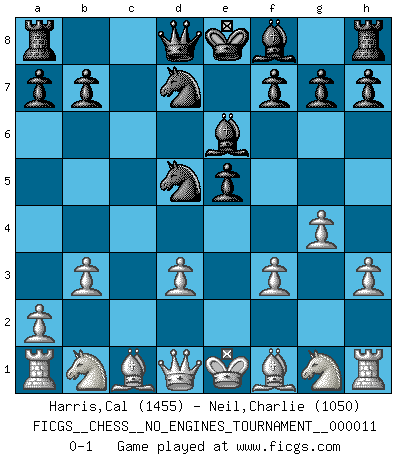 Last move : 0-1 2008 November 11 14:52:52 [Event "FICGS__CHESS__NO_ENGINES_TOURNAMENT__000011"] [Site "FICGS"] [Date "2008.09.17"] [Round "1"] [White "Harris,Cal"] [Black "Neil,Charlie"] [Result "0-1"] [WhiteElo "1455"] [BlackElo "1050"] 1.e4 c6 2.c4 d6 3.h3 Nf6 4.f3 e5 5.g4 Be6 6.b3 Nbd7 7.d3 d5 8.exd5 cxd5 9.cxd5 Nxd5 0-1 This chess game has been lost on time (started : 2008.09.17 13:24:28) Caro-Kann : Anti-Caro-Kann defense Player Black won this chess game. Follow this game move after move (download)The sign of a great Master is his ability to win a won game quickly and painlessly. (Irving Chernev) Im Wettkampf zwischen starken Meistern kommen Fehler sehr selten vor, deshalb ist es mit bloßem Warten nicht getan. (José Raúl Capablanca) Me dio la sensación de como si yo estuviera jugando en contra del mismo Ajedrez. - al estar jugando en contra de Robert Fischer (Walter Shipman) À la honte des hommes, on sait que les lois du jeu sont les seules qui soient partout justes, claires, inviolables et exécutées. Pourquoi l'Indien qui a donné les règles du jeu d'échecs est-il obéi de bon gré dans toute la terre, et que les décrétales des papes, par exemple, sont aujourd'hui un objet d'horreur et de mépris ? C'est que l'inventeur des échecs combina tout avec justesse pour la satisfaction des joueurs, et que les papes, dans leurs décrétales, n'eurent en vue que leur seul avantage. L'Indien voulut exercer également l'esprit des hommes et leur donner du plaisir; les papes ont voulu abrutir l'esprit des hommes. Voltaire (Dictionnaire philosophique / Garnier 1967) My poor ole parrot... Is not in the circulation of displays ....poo hoo hoo :) (Wayne Lowrance's enigma)