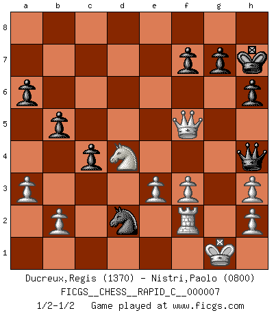 Last move : 1/2-1/2 2006 November 6 10:19:14 [Event "FICGS__CHESS__RAPID_C__000007"] [Site "FICGS"] [Date "2006.08.12"] [Round "1"] [White "Ducreux,Regis"] [Black "Nistri,Paolo"] [Result "1/2-1/2"] [WhiteElo "1370"] [BlackElo "0800"] 1.d4 d5 2.c4 e6 3.Nc3 Bb4 4.Bd2 Nf6 5.Nf3 O-O 6.e3 c5 7.dxc5 Bxc5 8.Be2 Nc6 9.cxd5 exd5 10.O-O Be6 11.Bb5 Qc7 12.Bxc6 Qxc6 13.Ne5 Qc7 14.Nf3 Rad8 15.Nb5 Qe7 16.a3 a6 17.Nc3 Rc8 18.Na4 b5 19.Nxc5 Rxc5 20.Bb4 Rfc8 21.Bxc5 Rxc5 22.Nd4 Bg4 23.Qd2 Ne4 24.Qa5 Qf6 25.Rac1 Rc4 26.Rxc4 dxc4 27.Qc7 h6 28.f3 Nd2 29.Rf2 Bh3 30.gxh3 Qh4 31.Qc8+ Kh7 32.Qf5+ Kg8 33.Qc8+ Kh7 34.Qf5+ 1/2-1/2 QGD : 3.Nc3 Kingside Castling by player Black (move 5) Kingside Castling by player White (move 10) This chess game ended in a draw. Follow this game move after move (download)The isolated Pawn casts gloom over the entire chessboard. (Aaron Nimzovich) Ich kämpfe solange mein Gegner einen Fehler machen kann. (Emanuel Lasker) Debió haber existido una vez en que los hombres eran semidióses, de otra manera no hubiesen podido inventar el Ajedrez. (Gustav Schenk) Des combinaisons [dans le jeu d'échecs] pareilles à des mélodies. Je crois entendre pour ainsi dire la musique des coups... (Vladimir Nabokov) History is a gallery of pictures in which there are few originals and many copies. (Alexis de Tocqueville)