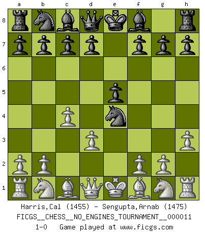 Last move : 1-0 2008 November 23 9:47:57 [Event "FICGS__CHESS__NO_ENGINES_TOURNAMENT__000011"] [Site "FICGS"] [Date "2008.09.17"] [Round "1"] [White "Harris,Cal"] [Black "Sengupta,Arnab"] [Result "1-0"] [WhiteElo "1455"] [BlackElo "1475"] 1.e4 e5 2.c4 Nf6 3.h3 Nxe4 4.d3 1-0 This chess game has been lost on time (started : 2008.09.17 13:24:28) King's pawn game Player White won this chess game. Follow this game move after move (download)By playing at Chess then, we may learn: First: Foresight... Second: Circumspection... Third: Caution... And lastly, we learn by Chess the habit of not being discouraged by present bad appearances in the state of our affairs, the habit of hoping for a favorable chance, and that of persevering in the secrets of resources. (Benjamin Franklin) Ein Teil des Fehlers ist immer korrekt. (Savielly Grigorievitsch Tartakower) La vida es como el Ajedrez, con lucha, competición y eventos buenos y malos. (Benjamin Franklin) Shah mat. Le roi est mort. Cri de fierté d'un joueur venant de terrasser son adversaire, courtoisement, sans effusion de sang. Train yourself to let go of everything you fear to lose. (Master Yoda in Star Wars ep.3)