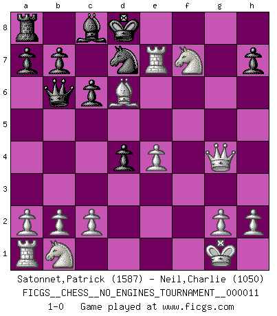 Last move : 1-0 2008 October 3 1:57:18 [Event "FICGS__CHESS__NO_ENGINES_TOURNAMENT__000011"] [Site "FICGS"] [Date "2008.09.17"] [Round "1"] [White "Satonnet,Patrick"] [Black "Neil,Charlie"] [Result "1-0"] [WhiteElo "1587"] [BlackElo "1050"] 1.e4 c6 2.d4 d5 3.f3 dxe4 4.fxe4 e5 5.Nf3 exd4 6.Bc4 Be7 7.O-O Qb6 8.Bxf7+ Kxf7 9.Ne5+ Ke8 10.Qh5+ g6 11.Nxg6 Bc5 12.Nxh8 Kd7 13.Qg4+ Kc7 14.Rf7+ Ne7 15.Rxe7+ Nd7 16.Bf4+ Bd6 17.Bxd6+ Kd8 18.Nf7+ 1-0 Caro-Kann : Tartakower (fantasy) variation Kingside Castling by player White (move 7) Player White won this chess game. Follow this game move after move (download)I look one move ahead... the best ! (Siegbert Tarrasch) Das Spiel gibt uns die Genugtuung, die das Leben uns versagt. (Emanuel Lasker) Las ideas audaces son como las piezas del Ajedrez que avanzan hacia adelante. Ellas pueden ser vencidas, pero también pueden iniciar una partida victoriosa. (Goethe) Roi des jeux et jeu des rois, les échecs portent en eux un sentiment d'infini. Ils donnent à celui qui s'est efforcé d'en approfondir les arcanes l'impression de n'être pas à la mesure de l'homme; en fait, ils constituent un résumé de l'univers, un microcosme, et figurent cette grande échelle qui, dans les plans de la lumière descend jusqu'à la matière, qui des abîmes insondables remonte jusqu'en l'infini de Dieu. (Pyrame) A good programmer is someone who always looks both ways before crossing a one-way street. (Doug Linder)