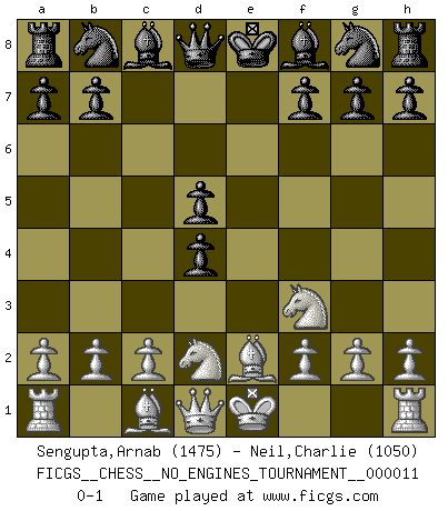 Last move : 0-1 2008 November 19 9:30:47 [Event "FICGS__CHESS__NO_ENGINES_TOURNAMENT__000011"] [Site "FICGS"] [Date "2008.09.17"] [Round "1"] [White "Sengupta,Arnab"] [Black "Neil,Charlie"] [Result "0-1"] [WhiteElo "1475"] [BlackElo "1050"] 1.e4 c6 2.d4 d5 3.Nd2 e6 4.Ngf3 c5 5.exd5 exd5 6.Be2 cxd4 0-1 This chess game has been lost on time (started : 2008.09.17 13:24:28) Caro-Kann : 3.Nd2 Player Black won this chess game. Follow this game move after move (download)All Chess players should have a hobby. (Savielly Tartakower) Wenn sie aufgeben, dann danke ich Ihnen für das Spiel (Eventualzug beim Fernschach). (Anonymous) La pasion por jugar al Ajedrez es una de las mas inexplicables en el mundo. (H.G. Wells) On peut tirer plus d'utilité d'une partie perdue que de 100 parties gagnées. (Capablanca) Mandala - that's it! 16x16 squares as multiple of the four and the eight because of the Four Noble Truths and the Noble Eightfold Path. (Heinz-Georg Lehnhoff about Big Chess)