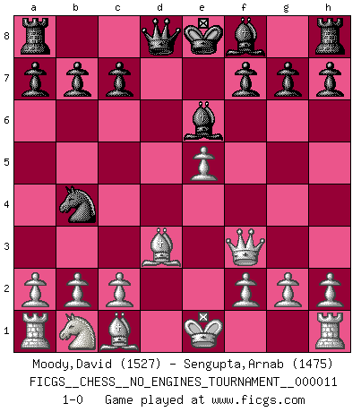 Last move : 1-0 2008 November 15 9:9:39 [Event "FICGS__CHESS__NO_ENGINES_TOURNAMENT__000011"] [Site "FICGS"] [Date "2008.09.17"] [Round "1"] [White "Moody,David"] [Black "Sengupta,Arnab"] [Result "1-0"] [WhiteElo "1527"] [BlackElo "1475"] 1.e4 e5 2.Nf3 Nf6 3.Bc4 d5 4.exd5 Nxd5 5.Nxe5 Nc6 6.d4 Nxe5 7.dxe5 Be6 8.Qf3 Nb4 9.Bd3 1-0 This chess game has been lost on time (started : 2008.09.17 13:24:28) Petrov : Italian variation Player White won this chess game. Follow this game move after move (download)That's what Chess is all about. One day you give your opponent a lesson, the next day he gives you one. (Bobby Fischer) Schach ist Krieg, im Schach geht es um testosterongesteuerte Urschreie. (Garry Kasparov) Yo he agregado estos principios a la ley: pongan los Caballos en acción antes de que los dos Alfiles sean desarrollados. (Emanuel Lasker) RxDa4 pat (...) Without enthusiasm, virtue functions not at all, and vice only poorly. (Mignon McLaughlin, The Neurotic's Notebook, 1960)