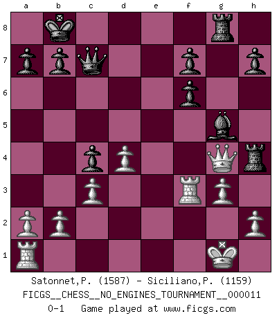 Last move : 0-1 2008 October 6 18:48:41 [Event "FICGS__CHESS__NO_ENGINES_TOURNAMENT__000011"] [Site "FICGS"] [Date "2008.09.17"] [Round "1"] [White "Satonnet,Patrick"] [Black "Siciliano,Pablo"] [Result "0-1"] [WhiteElo "1587"] [BlackElo "1159"] 1.e4 c5 2.f4 d5 3.Nc3 dxe4 4.Nxe4 Qc7 5.Nf3 Nf6 6.Bb5+ Bd7 7.Bxd7+ Nbxd7 8.d3 e6 9.O-O c4 10.f5 exf5 11.Nxf6+ Nxf6 12.Bg5 O-O-O 13.Bxf6 gxf6 14.d4 Bd6 15.c3 Rhg8 16.Qc2 Rg6 17.Qxf5+ Kb8 18.Qh3 Bf4 19.Nh4 Rh6 20.g3 Bg5 21.Rf3 Rg8 22.Qg4 Rxh4 0-1 Sicilian : Grand Prix attack Kingside Castling by player White (move 9) Queenside Castling by player Black (move 12) Player Black won this chess game. Follow this game move after move (download)If your opponent cannot do anything active, then don't rush the position; instead you should let him sit there, suffer, and beg you for a draw. (Jeremy Silman) Ich bin der einzige Schachspieler, der sich während der Vorbereitungen zum Turnier verletzt hat. (Woody Allen) El Ajedrez es 99 por ciento táctica. (Teichmann) Karpov est une pièce de musée. (Garry Kasparov) It is the aim of the modern school, not to treat every position according to one general law, but according to the principle inherent in the position. (Richard Reti)