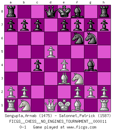 Last move : 0-1 2008 November 16 9:11:8 [Event "FICGS__CHESS__NO_ENGINES_TOURNAMENT__000011"] [Site "FICGS"] [Date "2008.09.17"] [Round "1"] [White "Sengupta,Arnab"] [Black "Satonnet,Patrick"] [Result "0-1"] [WhiteElo "1475"] [BlackElo "1587"] 1.d4 d5 2.c4 dxc4 3.e4 Nc6 4.Nf3 Bg4 5.d5 Ne5 6.Bf4 Ng6 7.Be3 Nf6 0-1 This chess game has been lost on time (started : 2008.09.17 13:24:28) QGA : 3.e4 Player Black won this chess game. Follow this game move after move (download)If cunning alone were needed to excel, women would be the best Chess players. (Albin) Ich weiss nicht was Gott gegen mich auf 1.e4 antworten würde. (Robert James Fischer) El Ajedrez es realmente noventa y nueve por ciento calculación. (Soltis) Le pion, dans sa simplicité, marche droit devant lui, mais lorsqu'il prend, il le fait obliquement? Ainsi l'homme, tant qu'il reste pauvre, marche dans la droiture et vit honnêtement, mais lorsqu'il recherche les honneurs, il flatte, se parjure et, par les voies obliques, cherche une position supérieure sur l'échiquier du monde. (Jean de Galles) God, you are such an idiot. - Actually, I thought I was more of a jerk. (Gregory House to Stacy Warner, House M.D.)