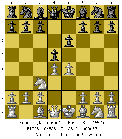 Last move : 1-0 2008 November 24 21:55:5 [Event "FICGS__CHESS__CLASS_C__000093"] [Site "FICGS"] [Date "2008.09.17"] [Round "1"] [White "Konuhov,Konstantin"] [Black "Hosea,Sangeeta"] [Result "1-0"] [WhiteElo "1600"] [BlackElo "1652"] 1.e4 e6 2.d4 d5 3.Nc3 1-0 This chess game has been lost on time (started : 2008.09.17 22:41:38) French : Paulsen variation Player White won this chess game. Follow this game move after move (download)At this time Fischer is simply a level above all the best Chessplayers in the world. (John Jacobs) Jeder Schachmeister war einmal ein Anfänger. (Irving Chernev) Uno no tiene que jugar muy bien, es suficiente jugar mejor que el oponente. (Siegbert Tarrasch) Un footballeur joue avec ses pieds, parfois avec sa tête. Un joueur d'échecs ne joue qu'avec sa tête. Et quand il ne joue plus, il meurt. (Jacob Murray) Do you know these so called Volunteers don't even get paid! (Simpsons)