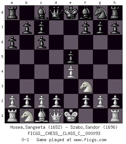 Last move : 0-1 2008 November 11 14:52:52 [Event "FICGS__CHESS__CLASS_C__000093"] [Site "FICGS"] [Date "2008.09.17"] [Round "1"] [White "Hosea,Sangeeta"] [Black "Szabo,Sandor"] [Result "0-1"] [WhiteElo "1652"] [BlackElo "1696"] 1.e4 e5 2.Nf3 Nc6 3.Bb5 a6 4.Bxc6 dxc6 0-1 This chess game has been lost on time (started : 2008.09.17 22:41:38) Ruy Lopez : Exchange variation Player Black won this chess game. Follow this game move after move (download)A sacrifice is best refuted by accepting it. (Wilhelm Steinitz) Die Arbeit ist etwas Unnatürliches. Die Faulheit allein ist göttlich. (Anatole France) Un Peón pasado aumenta su poder a medida de que el número de piezas en el tablero disminuye. (Capablanca) Même si l'adversaire joue le coup analysé précédemment, recommencez l'analyse en voyant la nouvelle position. Première règle de Blumenfeld Experience is the name we all give to our mistakes. (Oscar Wilde)