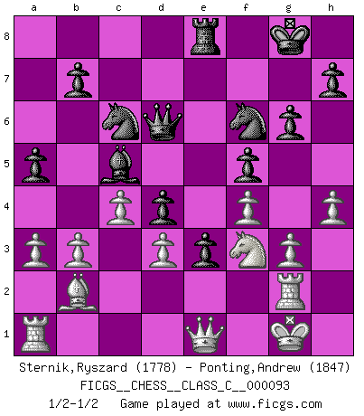 Last move : 1/2-1/2 2008 November 9 22:0:25 [Event "FICGS__CHESS__CLASS_C__000093"] [Site "FICGS"] [Date "2008.09.17"] [Round "1"] [White "Sternik,Ryszard"] [Black "Ponting,Andrew"] [Result "1/2-1/2"] [WhiteElo "1778"] [BlackElo "1847"] 1.Nf3 d5 2.c4 d4 3.g3 c5 4.Bg2 Nc6 5.O-O e5 6.d3 Bd6 7.e3 Nge7 8.exd4 cxd4 9.a3 a5 10.Nbd2 O-O 11.b3 f5 12.Re1 Ng6 13.Qc2 Bc5 14.Bb2 Qf6 15.Re2 Be6 16.Rae1 Bf7 17.h4 Rae8 18.Ng5 e4 19.f4 e3 20.Nf1 Qd6 21.Nxf7 Rxf7 22.Bd5 Nge7 23.Bxf7+ Kxf7 24.Ra1 Ng8 25.Nh2 Nf6 26.Qd1 Kg8 27.Nf3 Nh5 28.Rg2 g6 29.Qe1 Nf6 1/2-1/2 Reti : Advance variation Kingside Castling by player White (move 5) Kingside Castling by player Black (move 10) This chess game ended in a draw. Follow this game move after move (download)The stomach is an essential part of the Chess master. (Bent Larsen) Drei Punkte vor allen anderen ist wie einer, der im weißen Anzug posiert, während der Rest in Müllsäcke gekleidet dasteht. (Viktor Kortschnoi) El Ajedrez es tan interesante por sí solo, que no es necesario un interés monetario para persuadir a una persona a que lo practique; por lo tanto, nunca se juega por dinero. (Benjamin Franklin) Des combinaisons [dans le jeu d'échecs] pareilles à des mélodies. Je crois entendre pour ainsi dire la musique des coups... (Vladimir Nabokov) The large trees attract high winds. (Chinese proverb)