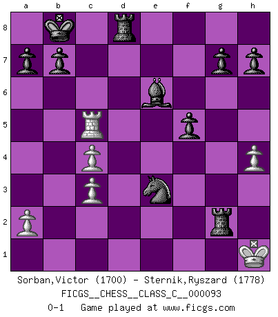 Last move : 0-1 2008 October 3 20:58:6 [Event "FICGS__CHESS__CLASS_C__000093"] [Site "FICGS"] [Date "2008.09.17"] [Round "1"] [White "Sorban,Victor"] [Black "Sternik,Ryszard"] [Result "0-1"] [WhiteElo "1700"] [BlackElo "1778"] 1.f4 e5 2.Nf3 e4 3.Nd4 c5 4.e3 cxd4 5.exd4 d5 6.Bb5+ Nc6 7.Nc3 Nf6 8.d3 Bb4 9.f5 Qb6 10.Bg5 Qxb5 11.O-O Bxc3 12.bxc3 Ne7 13.Rb1 Qc6 14.c4 Nxf5 15.Bxf6 Qxf6 16.dxe4 dxe4 17.Rb5 Qxd4+ 18.Qxd4 Nxd4 19.Re5+ Be6 20.Rd1 O-O-O 21.Rc5+ Kb8 22.Re1 f5 23.c3 Nc2 24.Re2 e3 25.h3 Rd1+ 26.Kh2 Rd2 27.Rxe3 Nxe3 28.h4 Rxg2+ 29.Kh1 Rd8 0-1 Bird : From gambit Kingside Castling by player White (move 11) Queenside Castling by player Black (move 20) Player Black won this chess game. Follow this game move after move (download)Chess is a beautiful mistress. (Bent Larsen) Ein bischen Romantik kann weder im Schach noch in der Liebe schaden. Also versuche ich mich ab und zu daran zu erinnern. (Nigel Short) Yo nunca en mi vida he jugado la Defensa Francesa, que viene siendo la más aburrida de todas las Aperturas. (Wilhelm Steinitz) Shah mat. Le roi est mort. Cri de fierté d'un joueur venant de terrasser son adversaire, courtoisement, sans effusion de sang. In my experience, there's no such thing as luck. (Obi-Wan Kenobi in Star Wars ep.4)