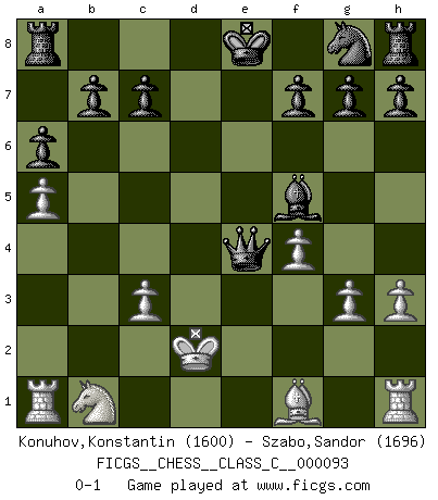 Last move : 0-1 2009 March 4 17:12:43 [Event "FICGS__CHESS__CLASS_C__000093"] [Site "FICGS"] [Date "2008.09.17"] [Round "1"] [White "Konuhov,Konstantin"] [Black "Szabo,Sandor"] [Result "0-1"] [WhiteElo "1600"] [BlackElo "1696"] 1.e4 e5 2.Nf3 Nc6 3.d4 exd4 4.Nxd4 Bc5 5.Be3 Qf6 6.c3 a6 7.b4 Ba7 8.Ne2 Bxe3 9.fxe3 Nxb4 10.Nd4 Qh4+ 11.Kd2 Nc6 12.Qf3 Ne5 13.Qf4 Qe7 14.Nf5 Qf6 15.h3 d5 16.Ng3 dxe4 17.Nxe4 Qe7 18.a4 Ng6 19.a5 Nxf4 20.exf4 Qxe4 21.g3 Bf5 0-1 Scotch game Player Black won this chess game. Follow this game move after move (download)If Chess is a science, it's a most inexact one. If Chess is an art, it is too exacting to be seen as one. If Chess is a sport, it's too esoteric. If Chess is a game, it's too demanding to be just a game. If Chess is a mistress, she's a demanding one. If Chess is a passion, it's a rewarding one. If Chess is life, it's a sad one. (Unknown) Mutter, ich bin eben Ex-Weltmeister geworden. --beim nach Hause Kommen nach dem Verlust des WM-Titels an Mihail Botvinnik -- (Mikhail Nekhemyevich Tal) Hay dos clases de hombres: aquellos que se conforman en dejarse llevar por las circunstancias y que juegan barajas y aquellos decididos a controlar las circunstancias y que juegan al Ajedrez. (Mortimer Collins) Aidez vos pièces, elles vous aideront. (Paul Morphy) Unless I accept my faults I will most certainly doubt my virtues. (Hugh Prather)