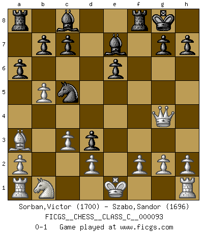 Last move : 0-1 2009 February 25 9:44:14 [Event "FICGS__CHESS__CLASS_C__000093"] [Site "FICGS"] [Date "2008.09.17"] [Round "1"] [White "Sorban,Victor"] [Black "Szabo,Sandor"] [Result "0-1"] [WhiteElo "1700"] [BlackElo "1696"] 1.e4 e5 2.Nf3 Nc6 3.Bb5 a6 4.Bxc6 dxc6 5.c3 Qd3 6.Nxe5 Nf6 7.Nxd3 Be7 8.b3 Nd7 9.Ba3 c5 10.b4 c4 11.e5 cxd3 12.e6 fxe6 13.Qg4 O-O 14.b5 Nc5 0-1 This chess game has been lost on time (started : 2008.09.17 22:41:38) Ruy Lopez : Exchange variation Kingside Castling by player Black (move 13) Player Black won this chess game. Follow this game move after move (download)Nonsense was the last thing Fischer was interested in, as far as Chess was concerned. (Elie Agur) Was ist der Unterschied zwischen einem Strassenarbeiter und einem Schachspieler? --Der Schachspieler bewegt sich ab und zu. (Anonymous) Todo se encuentra en un estado de flujo y esto incluye al mundo del Ajedrez. (Mikhail Botvinnik) Les Echecs sont affaire de jugement sensible. Savoir quand frapper et quand esquiver. (Fischer) God is an atheist. (Unknown)
