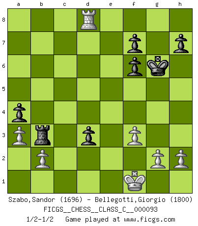 Last move : 1/2-1/2 2009 March 18 19:29:18 [Event "FICGS__CHESS__CLASS_C__000093"] [Site "FICGS"] [Date "2008.09.17"] [Round "1"] [White "Szabo,Sandor"] [Black "Bellegotti,Giorgio"] [Result "1/2-1/2"] [WhiteElo "1696"] [BlackElo "1800"] 1.d4 Nf6 2.c4 e6 3.Nc3 Bb4 4.Nf3 b6 5.e3 Bb7 6.Bd3 O-O 7.O-O d5 8.cxd5 exd5 9.Qa4 a5 10.Ne5 Qe7 11.f3 Nbd7 12.Nxd7 Nxd7 13.a3 Nf6 14.Nb5 Bd6 15.Bd2 Ba6 16.Qc2 c5 17.Nxd6 Bxd3 18.Qxd3 Qxd6 19.dxc5 bxc5 20.Rfd1 Rfd8 21.Rac1 a4 22.Be1 Qe7 23.Qc3 c4 24.Bh4 Rab8 25.Kf1 Rb3 26.Qd4 Re8 27.Bxf6 gxf6 28.Qxd5 Qxe3 29.Re1 Qd3+ 30.Qxd3 Rxe1+ 31.Rxe1 cxd3 32.Re8+ Kg7 33.Rd8 Kg6 1/2-1/2 Nimzo-Indian : Three knights variation Kingside Castling by player Black (move 6) Kingside Castling by player White (move 7) This chess game ended in a draw. Follow this game move after move (download)One bad move nullifies forty good ones. (Horowitz) Wenn du nicht weißt was du tun sollst, warte bis dein Gegner eine Idee hat. Sie wird sicher schlecht sein. (Siegbert Tarrasch) Un Peón pasado aumenta su poder a medida de que el número de piezas en el tablero disminuye. (Capablanca) Toutes les manuvres exécutées sur une colonne ouverte ont pour but ultime l'intrusion définitive sur la septième ou la huitième rangée, en plein cur de la position ennemie. (Aaron Nimzovitch) How many people work in NATO Headquarters ? - About half of them. (Dirk Stikker, NATO general secretary)