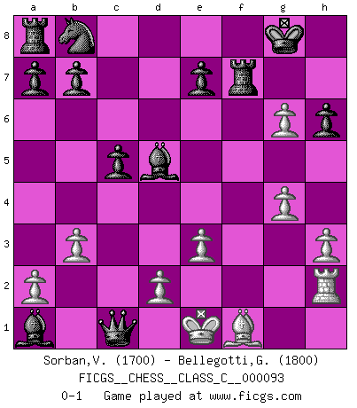 Last move : 0-1 2008 October 3 20:59:47 [Event "FICGS__CHESS__CLASS_C__000093"] [Site "FICGS"] [Date "2008.09.17"] [Round "1"] [White "Sorban,Victor"] [Black "Bellegotti,Giorgio"] [Result "0-1"] [WhiteElo "1700"] [BlackElo "1800"] 1.f4 d5 2.Nf3 Nf6 3.e3 g6 4.c4 Bg7 5.Nc3 O-O 6.b3 c5 7.Nxd5 Nxd5 8.cxd5 Bxa1 9.Ng5 h6 10.Nxf7 Rxf7 11.Qg4 Bxg4 12.h3 Bf5 13.g4 Be4 14.Rh2 Bxd5 15.Ba3 Qa5 16.f5 Qxa3 17.fxg6 Qc1+ 0-1 Bird's Opening Kingside Castling by player Black (move 5) Player Black won this chess game. Follow this game move after move (download)Discovered check is the dive bomber of the Chessboard. (Reuben Fine) Wenn Spassky eine Figur opfert kannst du genauso gut aufgeben. Aber wenn Tal eine Figur opfert, spiel weiter. Er könnte noch eine weitere opfern, und dann ... wer weiß? (Miguel Najdorf) Todavía soy una víctima del Ajedrez. Tiene toda la belleza del arte y mucho mas. No puede ser comercializado. El Ajedrez es mas puro que el arte en su posición social. (Marcel Duchamp) Les Cavaliers se révèlent fort utiles dans les positions fermées. D'habitude, les Fous sont un peu plus forts que les Cavaliers dans les positions ouvertes. Qu'on le veuille ou non, il restera toujours des exceptions ! I feel so... helpless. (C-3PO in Star Wars ep.3)