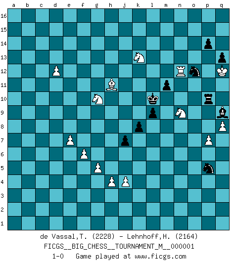 Last move : 1-0 2010 January 3 0:35:29 [Event "FICGS__BIG_CHESS__TOURNAMENT_M__000001"] [Site "FICGS"] [Date "2008.09.18"] [Round "1"] [White "de Vassal,Thibault"] [Black "Lehnhoff,Heinz-Georg"] [Result "1-0"] [WhiteElo "2228"] [BlackElo "2164"] 1.j2-k4 g15-g14 2.h1-o7 m15-m13 3.o7-c7 j15-k13 4.c7-c15 h16-o10 5.c15-f12 h15-g13 6.m2-m4 e15-e13 7.f12-a7 n15-n13 8.h2-g4 b16-c14 9.k1-l3 d15-d13 10.p1-o3 f16-b12 11.g1-j2 k16-h15 12.l3-j4 c16-h11 13.a7-d4 o10-o13 14.d4-d13 o13-c2 15.b1-c3 c2-k9 16.l1-p5 e16-d16 17.d13-b11 h11-e14 18.b11-p11 o15-o14 19.e2-e3 p16-q14 20.d2-d4 q14-o13 21.p11-p12 d16-d12 22.p12-p8 a16-d16 23.n2-n3 d12-d8 24.p8-m5 m13-m12 25.e1-d1 k9-p9 26.f1-b5 g16-j15 27.o1-j6 l16-n14 28.q2-q4 o16-d6 29.g4-e5 d6-a9 30.m5-k5 a9-c11 31.b2-b3 o13-n11 32.f2-f3 n14-l12 33.c1-a3 c11-f8 34.a3-f8 b12-f8 35.a2-a4 j15-h13 36.e5-c6 d8-d12 37.a1-c1 m16-m14 38.o3-n5 m14-k14 39.k5-n2 l12-b3 40.d1-d2 b3-h9 41.c1-b1 h9-j8 42.e3-e4 p9-a9 43.j1-k1 k13-l11 44.n5-m3 e14-d13 45.o2-o3 d13-g10 46.d4-d5 a9-f4 47.d2-b2 j8-g6 48.k1-l1 d12-j12 49.c6-e7 g6-e8 50.e7-g6 f4-f6 51.b5-e8 g10-e8 52.g6-f8 f6-f8 53.b2-b8 f8-e9 54.c3-e2 j16-j15 55.b8-b15 e8-a4 56.b1-c1 d16-b16 57.b15-b16 c14-b16 58.c1-a1 a4-b5 59.e2-g3 q16-c16 60.m3-l5 a15-a13 61.l1-m2 j12-j7 62.m1-c1 j7-c7 63.c1-c7 c16-c7 64.q1-c1 c7-c1 65.a1-c1 b5-h11 66.j6-b13 b16-d15 67.n2-c12 h11-e14 68.c12-a12 k14-k12 69.a12-a4 k12-b12 70.a4-a13 e9-b6 71.b13-n2 b6-b2 72.c1-g1 k15-k13 73.j2-h4 b12-b3 74.g3-j2 q15-q13 75.a13-a16 b3-b16 76.a16-k7 n11-p12 77.k7-o11 e14-k9 78.o11-l14 b2-b6 79.n2-j6 k9-n12 80.l14-l13 j15-k15 81.l13-f8 f15-f13 82.l5-m3 d15-f14 83.g1-a1 f14-g12 84.a1-a15 b16-b15 85.f8-a13 b6-b14 86.a13-b14 b15-b14 87.p5-g13 h14-g13 88.a15-h15 k15-k14 89.p2-p4 l11-m13 90.q4-q5 m13-n11 91.h15-d15 e13-e12 92.f3-f4 g12-e13 93.d15-d8 l15-l13 94.e4-e5 e13-f11 95.f4-f5 p15-p14 96.d5-d6 h13-f12 97.e5-e6 g13-g12 98.o3-o4 j14-j13 99.p4-p5 j13-j12 100.q5-q6 l13-l12 101.n3-n4 k14-j13 102.o4-o5 k13-k12 103.p5-p6 k12-k11 104.q6-q7 j13-k12 105.n4-n5 l12-l11 106.o5-o6 n12-m11 107.q7-q8 f12-h11 108.d8-c8 g14-g13 109.c8-c1 g12-g11 110.m3-l5 f11-h10 111.k4-h5 m11-l10 112.p6-p7 j12-j11 113.j4-h6 j11-j10 114.j2-k4 k12-j11 115.l5-k7 k11-k10 116.k4-l6 j10-j9 117.k7-m8 l10-n12 118.m2-l3 f13-f12 119.h4-g6 e12-e11 120.d6-d7 m12-m11 121.l6-j7 l11-l10 122.j7-g8 h10-j12 123.d7-d8 n11-m9 124.h5-j7 m9-k8 125.j6-k5 n12-o11 126.e6-e7 n13-n12 127.g2-g4 j11-j10 128.m8-l6 k8-j6 129.h3-h4 j6-l7 130.k5-l4 k10-k9 131.c1-c10 j10-k11 132.g6-f8 p12-n11 133.f8-g10 j9-j8 134.g10-j9 h11-j9 135.g8-j9 k11-j11 136.j7-h9 j11-h12 137.l6-k8 n11-l12 138.c10-c15 l12-j13 139.c15-c16 j12-h10 140.g4-g5 o11-p12 141.h6-f7 o14-o13 142.f7-g9 o13-o12 143.h9-k10 l10-l9 144.k8-h9 b14-b9 145.c16-c9 b9-b10 146.l4-e10 j13-k11 147.j9-h11 f12-f11 148.g9-f11 h10-f11 149.e10-f11 g13-g12 150.c9-c12 k11-h10 151.f11-c14 p12-j6 152.c12-d12 g11-g10 153.h9-f8 j6-f9 154.h11-f12 h12-j11 155.k10-l12 j11-k12 156.l12-n13 g10-g9 157.f8-g10 b10-b14 158.c14-d15 h10-f11 159.d12-e12 b14-n14 160.d15-g12 f11-d10 161.e12-e13 k9-k8 162.n13-o15 l7-k5 163.l3-m2 k5-m4 164.e13-e11 m4-o3 165.m2-l3 o3-n5 166.e11-e9 f9-d7 167.f5-f6 d10-f9 168.g10-j9 f9-h10 169.g12-h11 d7-h3 170.e9-g9 n14-n15 171.o15-m16 n15-f15 172.f12-g10 j8-j7 173.g9-c9 h10-j8 174.c9-c12 k12-l11 175.c12-n12 n5-m7 176.n12-o12 f15-n15 177.l3-m2 m7-n5 178.k2-k3 n5-o3 179.m2-l3 n15-n3 180.l3-k2 n3-n1 181.j3-j4 j8-l7 182.m16-k15 o3-m4 183.d8-d9 l7-j6 184.d9-d10 j6-k4 185.d10-d11 k4-l2 186.d11-d12 n1-k1 187.k2-l3 k1-k3 188.l3-l4 h3-j2 189.l4-l5 k3-k6 190.h11-m7 m4-k3 191.l5-m5 l2-k4 192.m5-n5 k3-l5 193.m7-k9 k4-l6 194.n5-o4 k6-k4 195.o4-p5 l6-m8 196.k9-h11 m8-o7 197.p5-p6 o7-n5 198.p6-o5 l5-m3 199.o6-o7 k4-o4 200.o5-p5 n5-o3 201.p5-p6 m3-n5 202.p6-q7 o3-p5 203.q7-p8 n5-o7 204.o12-n12 o7-m8 205.p8-p9 o4-o9 206.p9-q10 m8-n10 207.j9-l8 o9-o10 208.q10-q11 j2-q9 209.k15-m14 n10-o12 210.q11-q12 o10-p10 211.m14-k13 l11-l10 212.l8-n9 1-0 Comment by player 1 : Thibault de Vassal : Thanks for a very nice game! Probably one of my favourites for a long time. It wasn't easy to predict the result (at least it couldn't have been a draw :)) ... Comment by player 2 : Heinz-Georg Lehnhoff : Thank you for this nice game, too. I was too slow :) Follow this game move after move (download)Chess is so inspiring that I do not believe a good player is capable of having an evil thought during the game. (Wilhelm Steinitz) Matt entspricht nicht immer den Tatsachen. (Savielly Grigorievitsch Tartakower) Una victoria por una combinación errónea, aunque sea espectacular, me llena de horror artístico. (Wilhelm Steinitz) Si rien de grave n'est détecté lors de l'analyse d'une position, on joue alors le coup. Seconde règle de Blumenfeld. However beautiful the strategy, you should occasionally look at the results. (Winston Churchill)