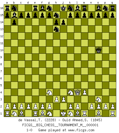 Last move : 1-0 2008 October 24 12:36:58 [Event "FICGS__BIG_CHESS__TOURNAMENT_M__000001"] [Site "FICGS"] [Date "2008.09.18"] [Round "1"] [White "de Vassal,Thibault"] [Black "Ould Ahmed,Samy"] [Result "1-0"] [WhiteElo "2228"] [BlackElo "1845"] 1.j2-k4 j15-h13 2.h2-g4 h16-o10 3.m2-m4 b15-b14 4.p1-o3 c16-b15 5.h1-l4 1-0 This big chess game has been lost on time (started : 2008.09.18 12:51:42) Follow this game move after move (download)Even the laziest King flees wildly in the face of a double check ! (Aaron Nimzowitsch) Du musst nicht gut spielen, es reicht, wenn du besser spielst als dein Gegner. (Anonymous) El Ajedrez por encima de todo... ¡es una pelea!. (Emanuel Lasker) Je ne suis pas le dernier à jouer lâchement des coups douteux pendant le zeïtnot de l'adversaire pour l'achever: en effet les coups qui font le plus peur sont ceux que l'on ne comprend pas. Je me fais souvent peur quand je joue. (Un professeur anonyme) Live, lose, and learn, by observing your opponent how to win. (Amber Steenbock)