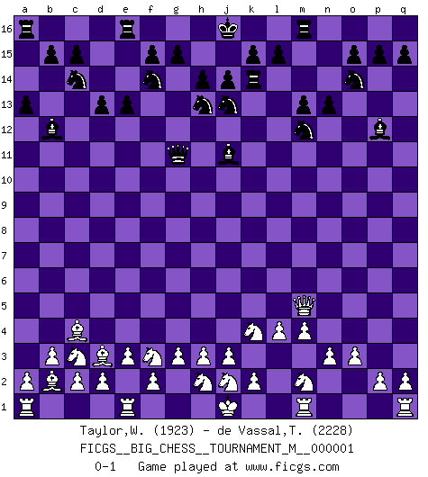 Last move : 0-1 2008 December 19 17:27:11 [Event "FICGS__BIG_CHESS__TOURNAMENT_M__000001"] [Site "FICGS"] [Date "2008.09.18"] [Round "1"] [White "Taylor,William"] [Black "de Vassal,Thibault"] [Result "0-1"] [WhiteElo "1923"] [BlackElo "2228"] 1.j2-k4 p16-o14 2.h1-o7 j15-h13 3.p1-o3 h15-j13 4.k1-l3 g16-f14 5.g1-f3 k16-l14 6.b1-c3 b16-c14 7.b2-b3 m15-m13 8.e2-e3 d15-d13 9.f1-d3 e15-e13 10.c1-b2 h16-p9 11.m2-m4 f16-b12 12.l1-p5 c16-j10 13.n2-n3 n15-n13 14.o1-h7 l16-p12 15.o7-n7 p9-p11 16.n7-m8 p11-g11 17.g2-g3 o16-f8 18.h7-k9 j10-l12 19.k9-m11 f8-j11 20.m8-m5 j11-p5 21.m11-l12 p5-j11 22.l12-c4 l14-m12 23.o3-m2 m16-m14 24.l3-j2 m14-k14 25.o2-o3 q16-m16 26.l2-l4 a15-a13 0-1 Follow this game move after move (download)White lost because he failed to remember the right continuation and had to think up the moves himself. (Siegbert Tarrasch) Kein Schachspieler kann gut schlafen. (H. G. Wells) El Ajedrez es en su esencia, un juego. En su forma, un arte. Y en su ejecución, una ciencia. (Baron Tassilo) Echiquier : carré parfait, comme la Jérusalem nouvelle décrite par l'auteur de l'Apocalypse, huit cases sur huit, exaltation du chiffre 4, symbole du cosmos aux quatre horizons... où le noir et le blanc, l'ombre et la lumière, le mal et le bien s'entremêlent et se conjuguent. (Robert Couffignal, Le Gambit du poète) Every vice is only an exaggeration of a necessary and virtuous function. (Ralph Waldo Emerson, Journals 1936)