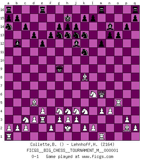 Last move : 0-1 2008 November 28 0:21:57 [Event "FICGS__BIG_CHESS__TOURNAMENT_M__000001"] [Site "FICGS"] [Date "2008.09.18"] [Round "1"] [White "Collette,Benjamin"] [Black "Lehnhoff,Heinz-Georg"] [Result "0-1"] [WhiteElo ""] [BlackElo "2164"] 1.j2-k4 g15-g14 2.b1-c3 m15-m13 3.d2-d3 j15-k13 4.p2-p3 h16-o10 5.g2-g3 o10-o2 6.p1-o3 o2-f10 7.h2-g4 e15-e13 8.h1-c6 h15-g13 9.k1-l3 k16-h15 10.l3-k5 n15-n13 11.c1-j7 o16-g9 12.j7-g9 f10-g9 13.c6-p6 p15-p14 14.m2-m4 p16-n15 15.n2-n4 o15-o13 16.o1-p2 n15-l14 17.l1-o4 b16-a14 18.f1-g2 d15-d13 19.g2-d5 c16-h11 20.e2-e4 f16-b12 21.k5-h4 c15-c14 22.o4-k8 l16-n14 23.g1-j2 g16-j15 24.q1-o1 h15-j13 25.o3-n5 j16-h15 26.n5-l6 h11-j12 27.p6-m6 e13-e12 28.j1-h2 j15-h13 29.o1-o5 j13-k11 30.e1-e3 f15-f13 31.j2-l3 l14-j13 32.l3-j4 m13-m12 0-1 Follow this game move after move (download)I prefer to lose a really good game than to win a bad one. (David Levy) Die Partien sind immer verschieden, die Interviews immer die gleichen. (Garry Kasparov) El Ajedrez es un cuento de Hadas de las 1001 metidas de pata. (Savielly Tartakower) Si je n'étais pas joueur d'échecs, je serais le meilleur dans quelque chose d'autre. (Anatoli Karpov) You can think I'm wrong, but that's no reason to quit thinking. (Gregory House, House M.D.)