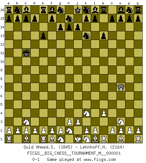 Last move : 0-1 2008 October 24 0:36:30 [Event "FICGS__BIG_CHESS__TOURNAMENT_M__000001"] [Site "FICGS"] [Date "2008.09.18"] [Round "1"] [White "Ould Ahmed,Samy"] [Black "Lehnhoff,Heinz-Georg"] [Result "0-1"] [WhiteElo "1845"] [BlackElo "2164"] 1.j2-k4 g15-g14 2.h1-o7 h16-c11 3.b1-c3 m15-m13 4.p1-o3 e15-e13 5.m2-m4 j15-k13 0-1 This big chess game has been lost on time (started : 2008.09.18 12:51:42) Follow this game move after move (download)Chess is imagination. (David Bronstein) Lisa Lane, amerikanische Schachmeisterin, hatte Fischer einmal als stärksten lebenden Spieler bezeichnet. Antwort: Das ist richtig, aber Lisa Lane ist eigentlich nicht in der Lage, das zu beurteilen. (Robert James Fischer) Repentinamente, me resultaba obvio en mi analisis que yo había pasado por alto lo que Fischer había visto en el tablero con la mas grande facilidad. (Mikhail Botvinnik) Une platitude souvent récitée à propos des Echecs est qu'une des choses les plus difficiles à réaliser est de gagner une position gagnante. Cela ne manque pas de sens mais, pour ma part, j'ai toujours trouvé plus difficile de gagner une position perdante. (Tim Krabbe) Wipe them out. All of them. (Darth Sidious in Star Wars ep.1)