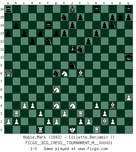 Last move : 1-0 2008 November 3 21:17:43 [Event "FICGS__BIG_CHESS__TOURNAMENT_M__000001"] [Site "FICGS"] [Date "2008.09.18"] [Round "1"] [White "Noble,Mark"] [Black "Collette,Benjamin"] [Result "1-0"] [WhiteElo "1843"] [BlackElo ""] 1.j2-k4 g15-g13 2.h1-o7 p16-o14 3.o7-f15 g16-f14 4.h2-g4 h14-h13 5.f15-a10 b15-b14 6.p1-o3 c16-b15 7.d2-d4 e15-e13 8.c1-h6 f16-c13 9.m2-m4 j15-g14 10.e2-e3 m15-m13 11.f1-b5 l16-o13 12.b1-a3 b16-c14 13.l1-p5 l15-l13 14.n2-n3 n15-n14 15.o1-j6 l13-l12 16.c2-c4 g14-f12 17.k1-h2 d15-d13 18.g1-j2 c14-b12 19.a10-a4 b12-d11 20.m1-m3 a15-a13 21.q1-m1 k16-m15 22.j2-h4 h16-p9 23.q2-q4 d13-d12 24.a1-c1 c13-b12 25.h2-j4 m15-l13 26.b5-f9 d11-f10 27.a4-c6 c15-c13 28.c1-c3 l13-k11 29.a3-b5 b15-n4 30.m3-l3 o13-j8 31.j6-n2 f14-g12 32.b5-d6 n4-o3 33.p2-o3 g12-h10 34.f9-h7 j8-g10 35.c6-f3 f10-h11 36.d6-f7 h11-j9 37.h7-b13 e16-f16 38.f7-h8 g10-d13 39.f3-b7 p9-o8 40.h4-g6 d13-o3 41.p5-o4 o3-n2 42.b13-n2 o16-j11 43.q4-q5 h10-g8 44.h6-k8 b12-k4 45.j3-k4 o8-k4 46.c3-b3 f16-f14 47.l3-k3 k4-q10 48.b7-a8 1-0 Follow this game move after move (download)Only the player with the initiative has the right to attack. (Wilhelm Steinitz) Schach verlangt totale Konzentration. (Robert James Fischer) Hoy en día, si tu no eres un Gran Maestro a los 14 años, es mejor que lo olvides. (Anand Viswanathan) La conception d'un plan est le processus par lequel un joueur exploite les avantages de sa position tout en s'efforçant d'en réduire au minimum les inconvénients. Afin de garantir le succès, un plan doit toujours se fonder sur un diagnostic objectif des particularités d'une position. La conception d'un plan est d'autant plus difficile que la position est équilibrée, et grandement facilitée lorsqu'il n'existe qu'un seul plan susceptible de répondre aux exigences de la position. (Harry Golombek) A cynic is a man who knows the price of everything but the value of nothing. (Oscar Wilde)